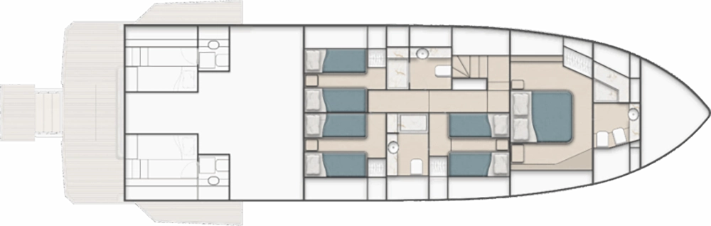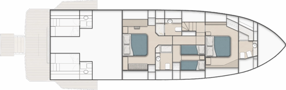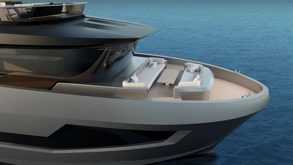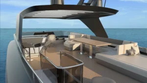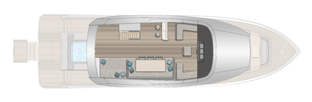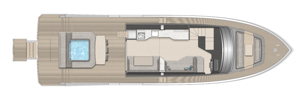 Unique in its range, the vessel features a hydromassage pool aft. The aft area extends to approximately 40 square meters, in addition to the over 15 square meters of space in the forward cockpit, which houses a large dinette. Upon request, a Transformer can be installed aft, and the swim platform can accommodate a tender up to 4.5 meters in length.