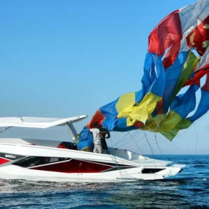 Equipped with a robust hydraulic winch system to deploy and retrieve the parasail safely. Towing pylon designed for optimal lift and stability during parasailing.