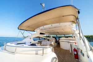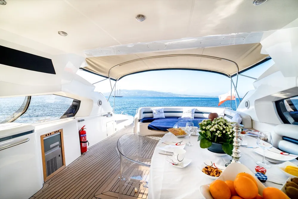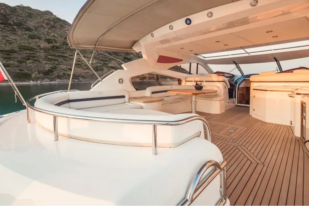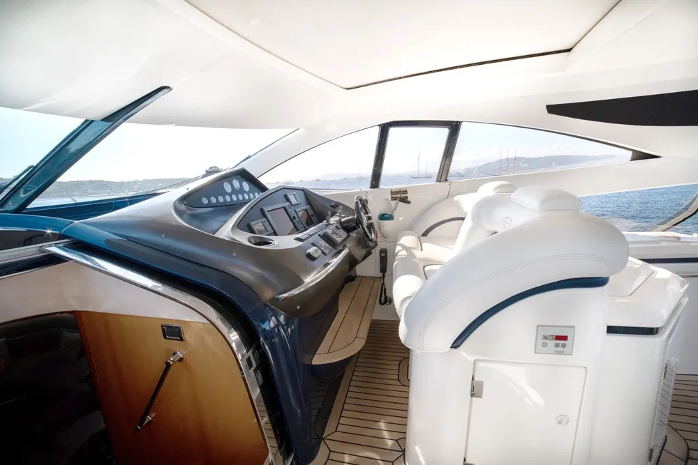 The cockpit is half-hidden thanks to the superstructure overhanging its roof. Here it is nice to just relax or have a snack al fresco. Water lovers will appreciate the hydraulic bathing platform. The mechanism of the platform will make it easier to descend and ascend from the water of the tender. For sunbathing, welcome to the huge aft sunbed or the bow deck.