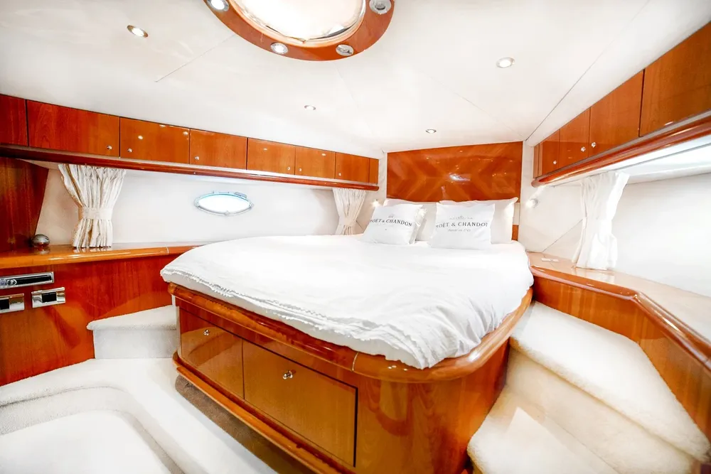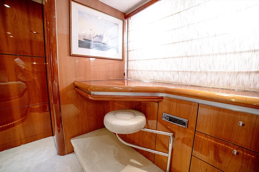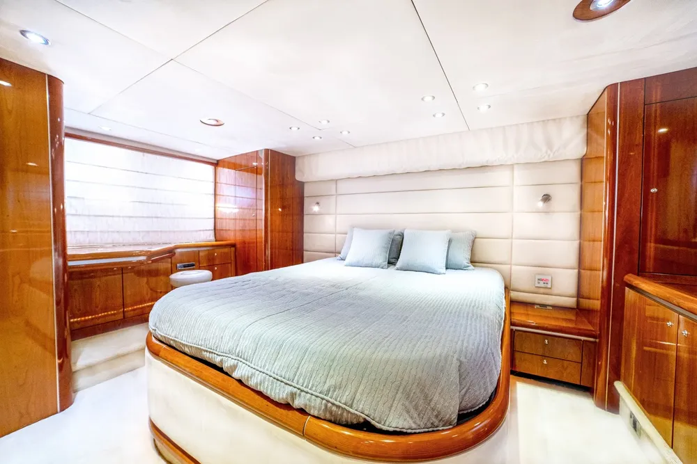 This highly sought-after optional interior layout consisting of three staterooms with aft full-beam master cabin, day head and crew quarters, allows for generous interior volume and guest versatility.