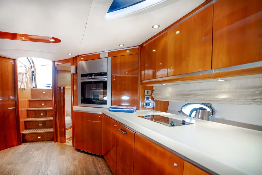 On the lower deck there are three cabins (all with their own bathroom) and a galley on the left when she descends into the residential suite. The master stateroom occupies the entire width of the hull, which is more than 4.5 meters. For a crew of 2, there is a special compartment aft of the yacht.
