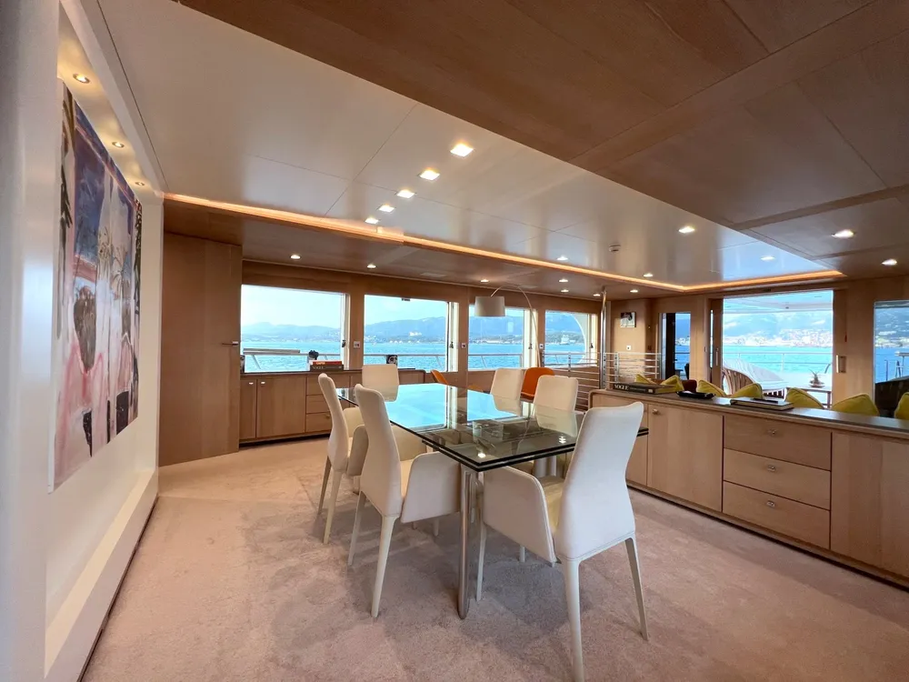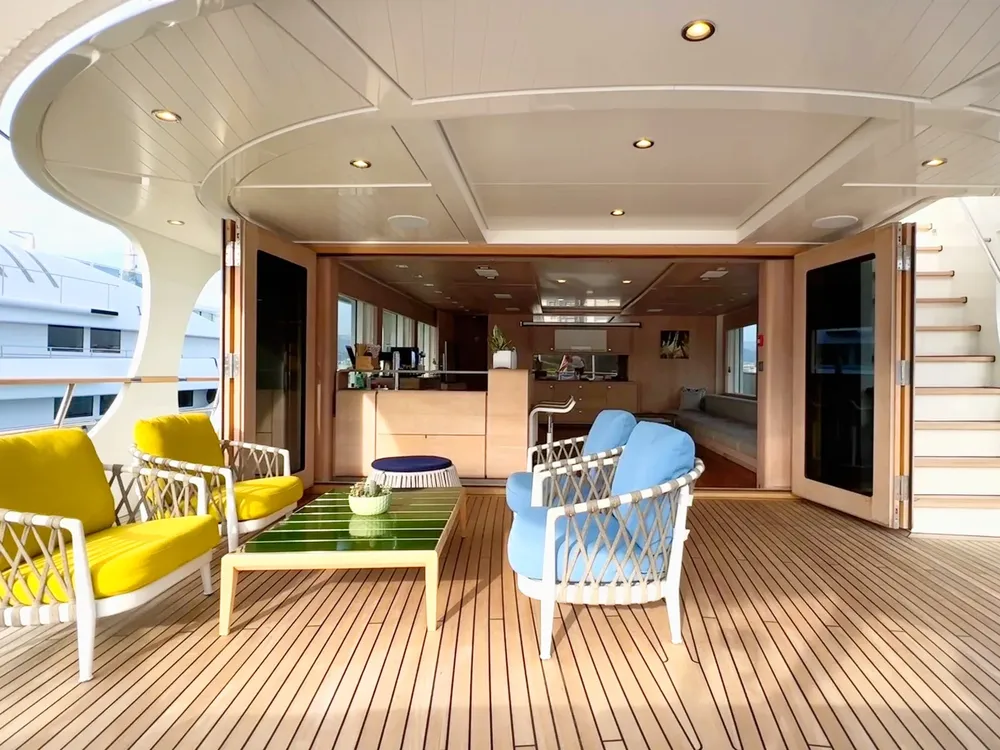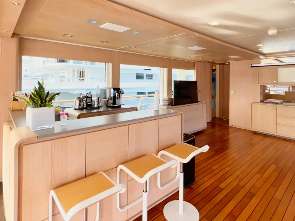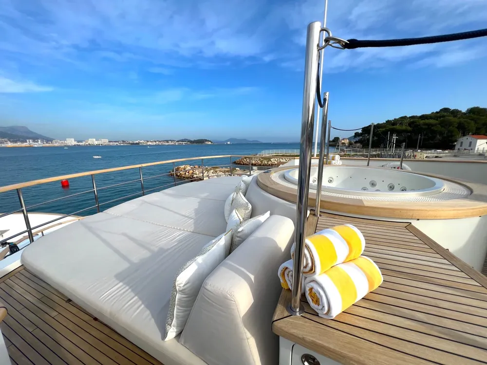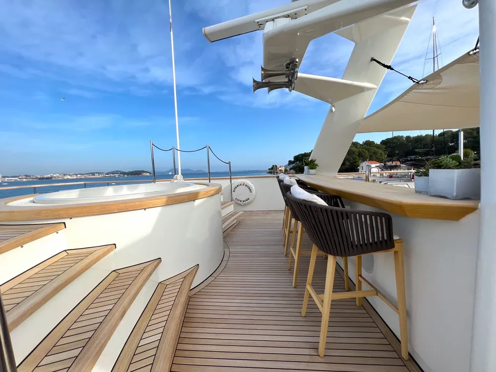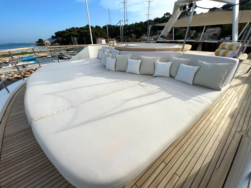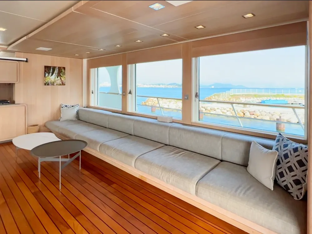 With a large beam of 8m allowing a facility of a 40m+ yacht, Robbie Bobby underwent an extensive refit to offer even more volume including a large sundeck with a new elevated jacuzzi and a bar with BBQ. The natural modern atmosphere can be enjoyed everywhere onboard. The retractable windows in the saloon and master cabin allow one to enjoy the sea breeze by opening them entirely.