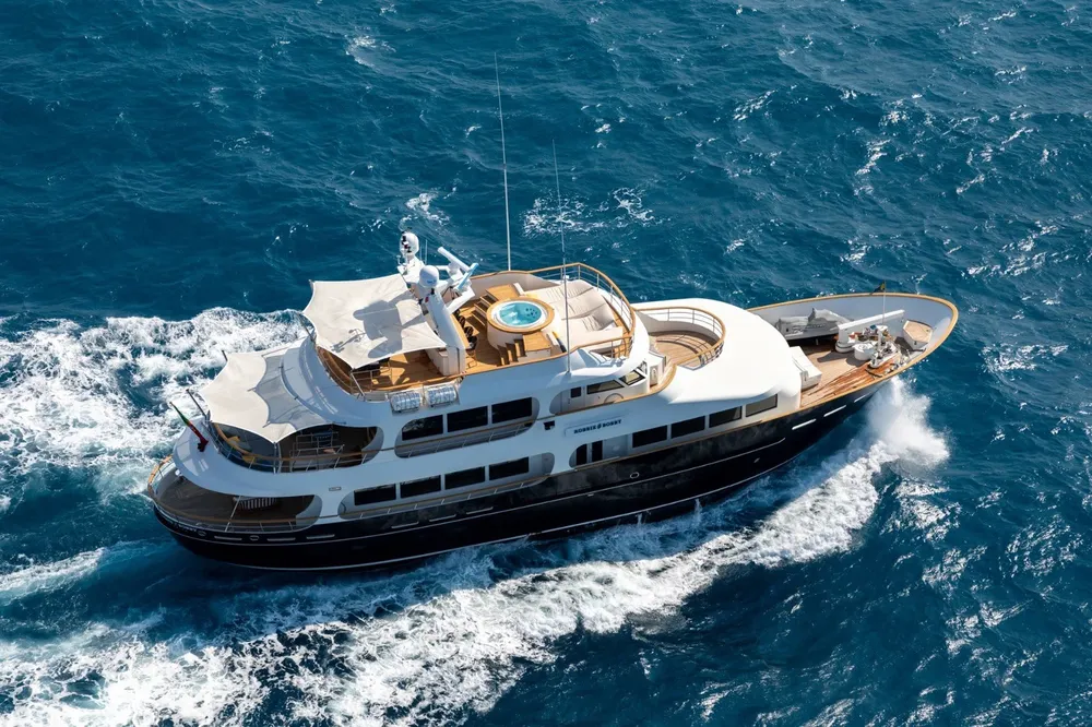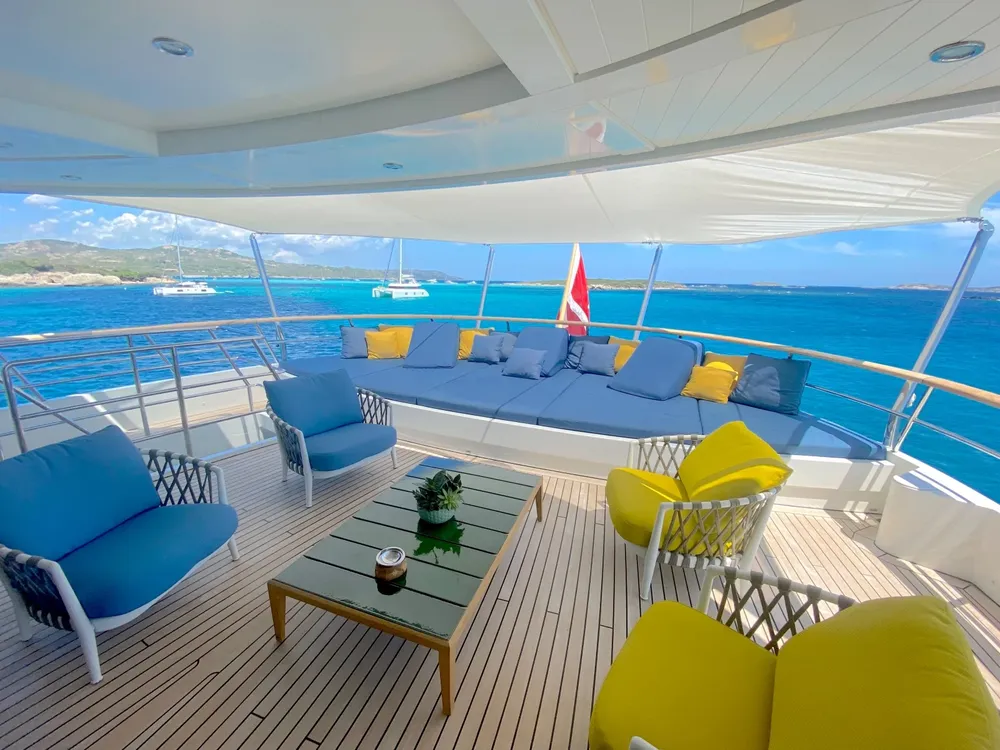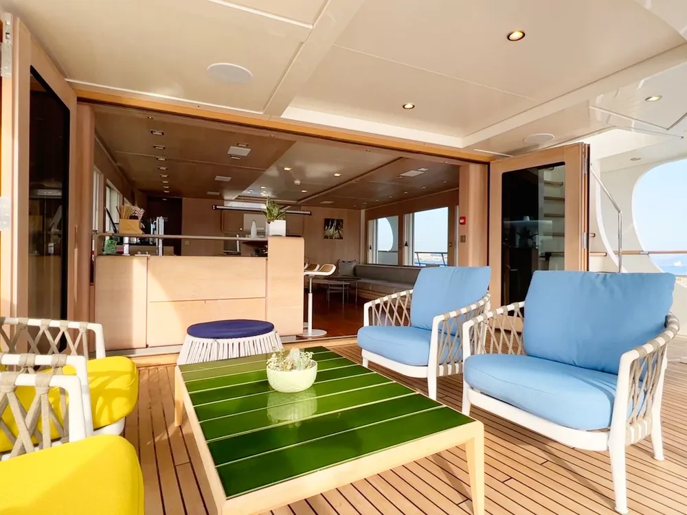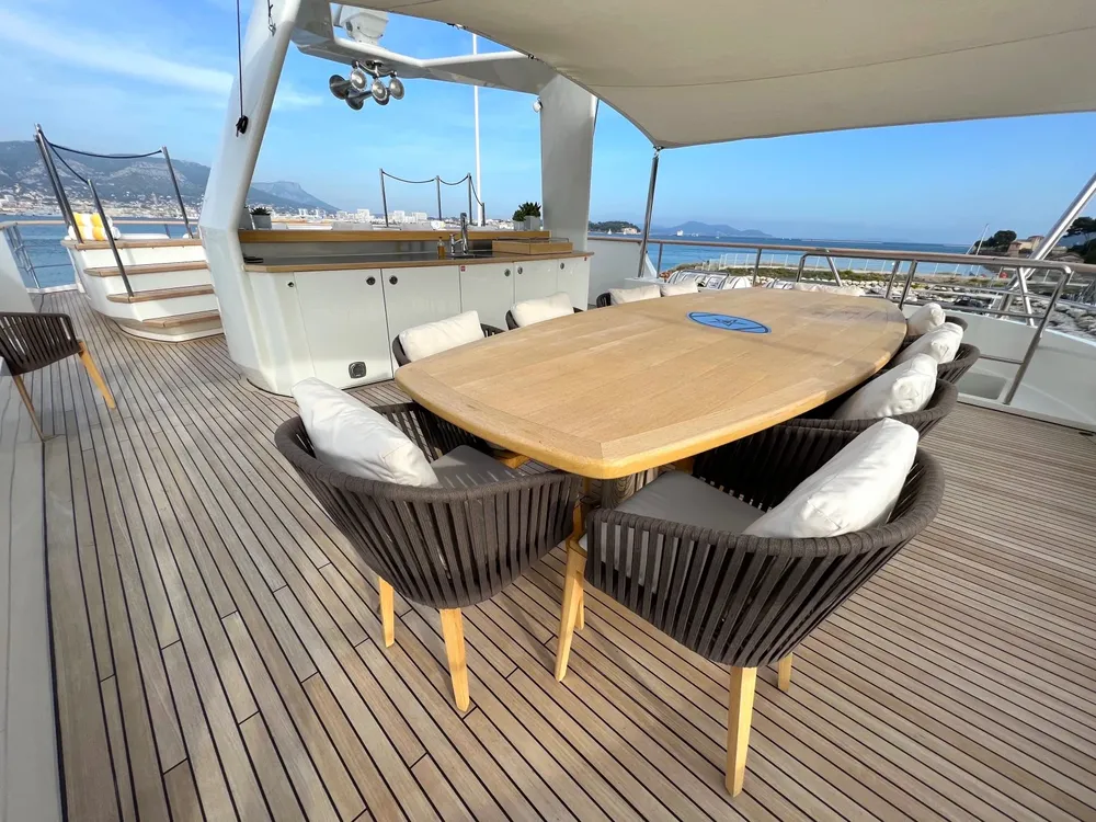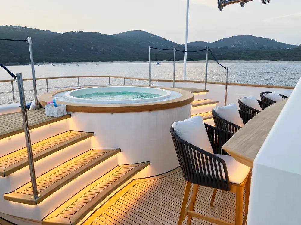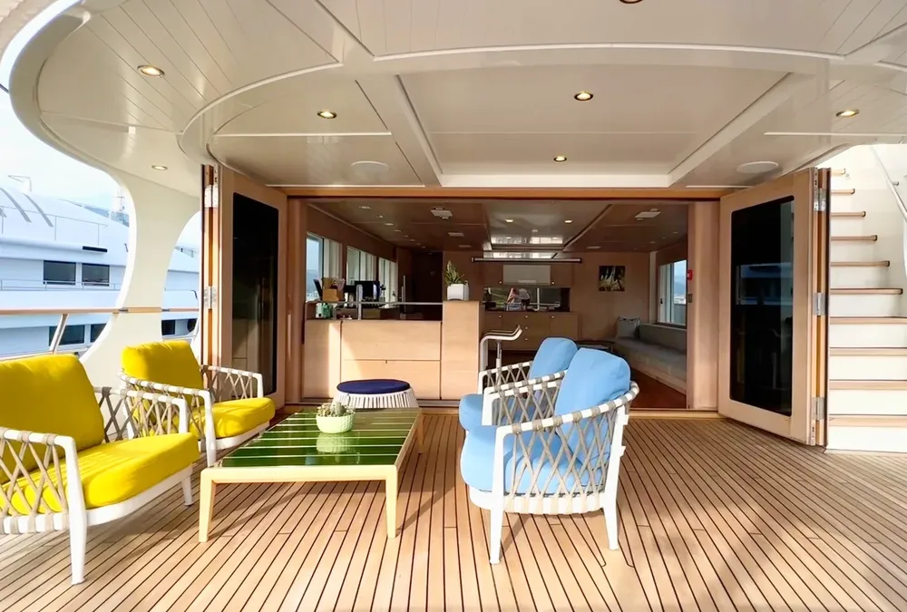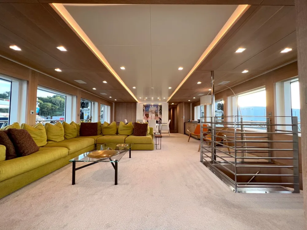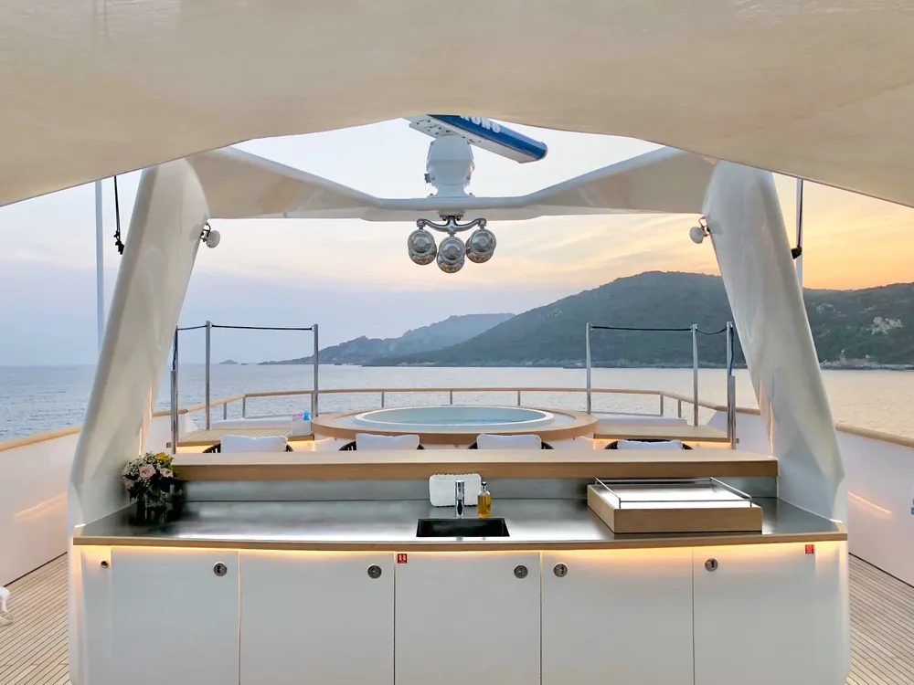 With a large beam of 8m allowing a facility of a 40m+ yacht, Robbie Bobby underwent an extensive refit to offer even more volume including a large sundeck with a new elevated jacuzzi and a bar with BBQ. The natural modern atmosphere can be enjoyed everywhere onboard. The retractable windows in the saloon and master cabin allow one to enjoy the sea breeze by opening them entirely.