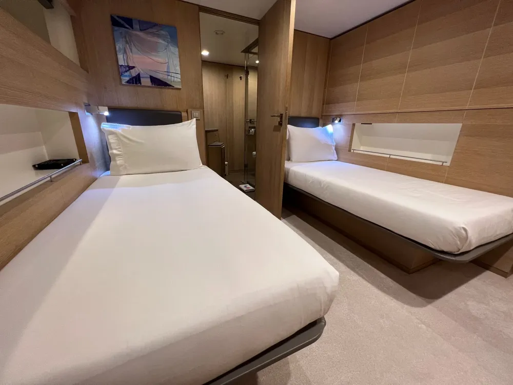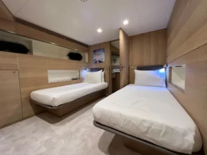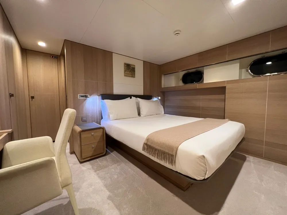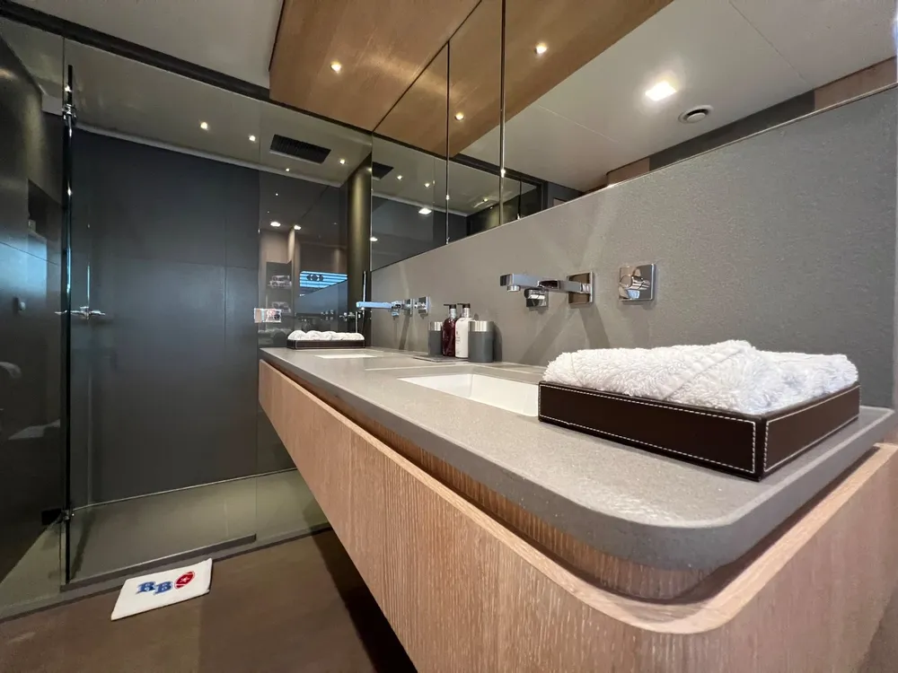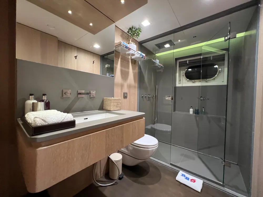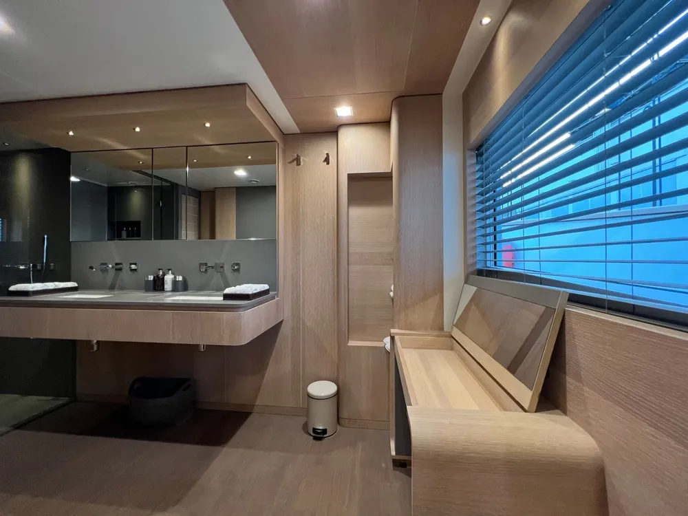 The full-beam master cabin is situated on the main deck, while the lower deck consists of two double cabins and two exceptionally large twin cabins, each with a pullman.