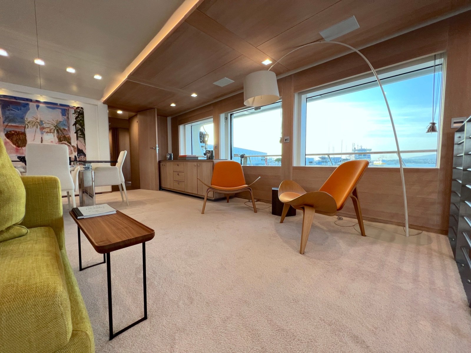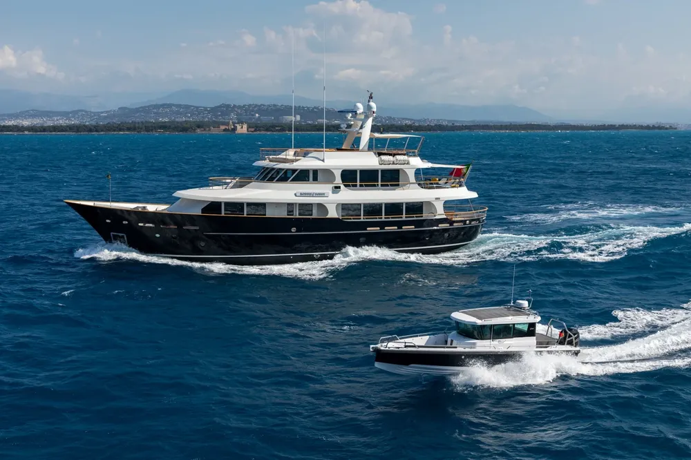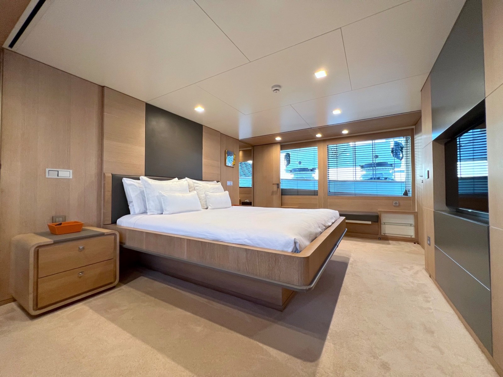 The full-beam master cabin is situated on the main deck, while the lower deck consists of two double cabins and two exceptionally large twin cabins, each with a pullman.
