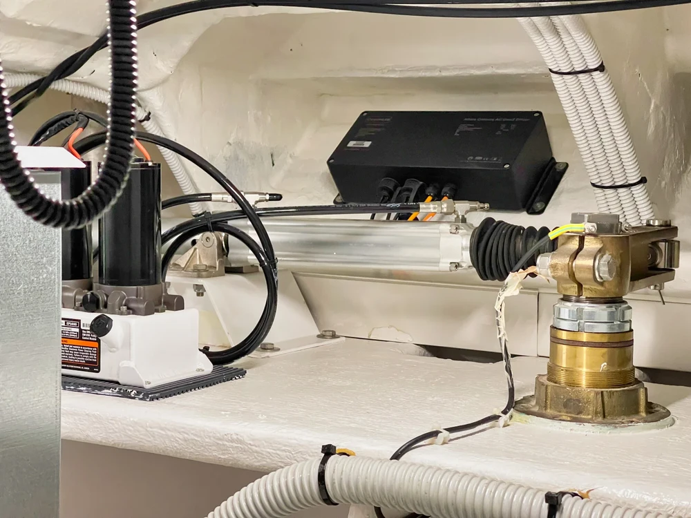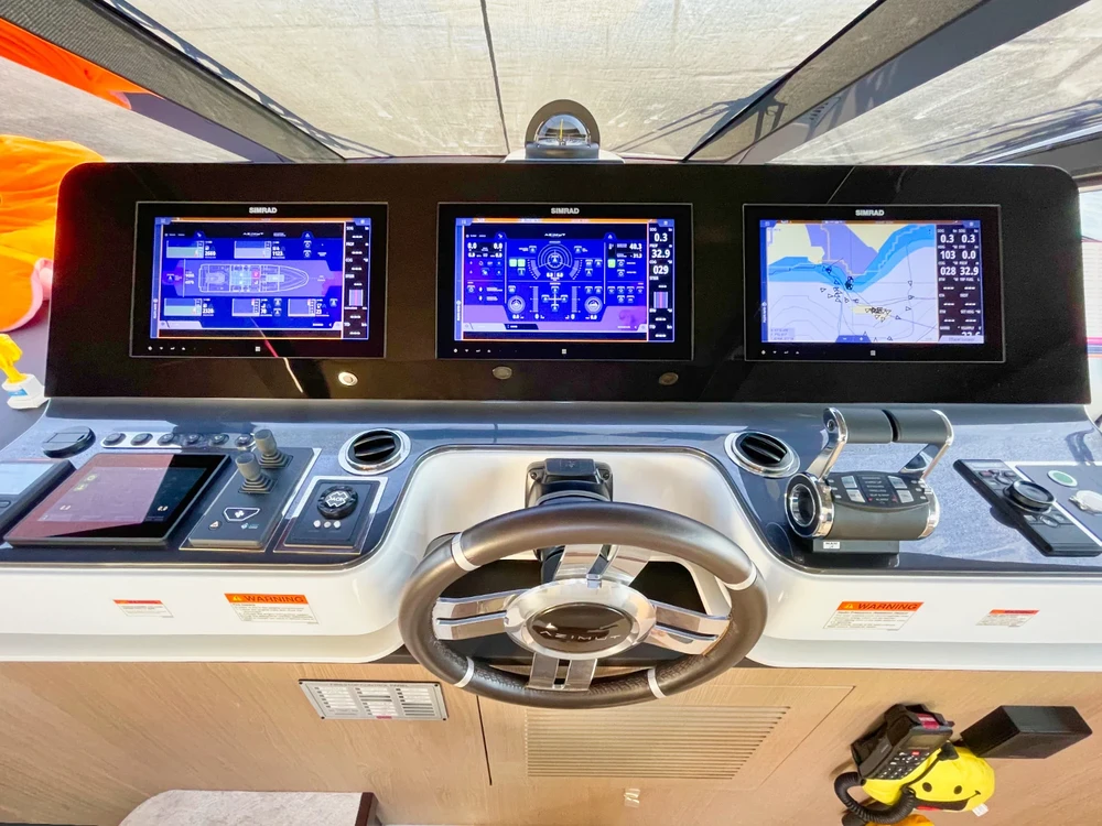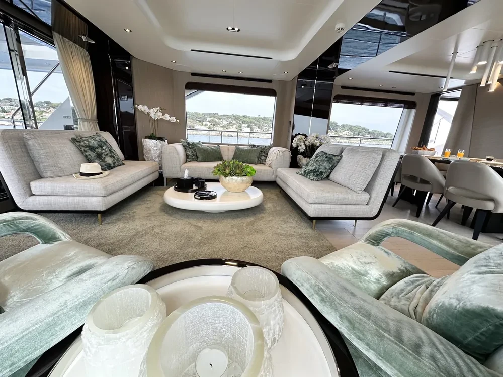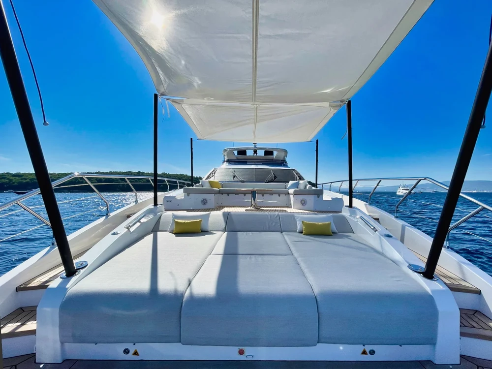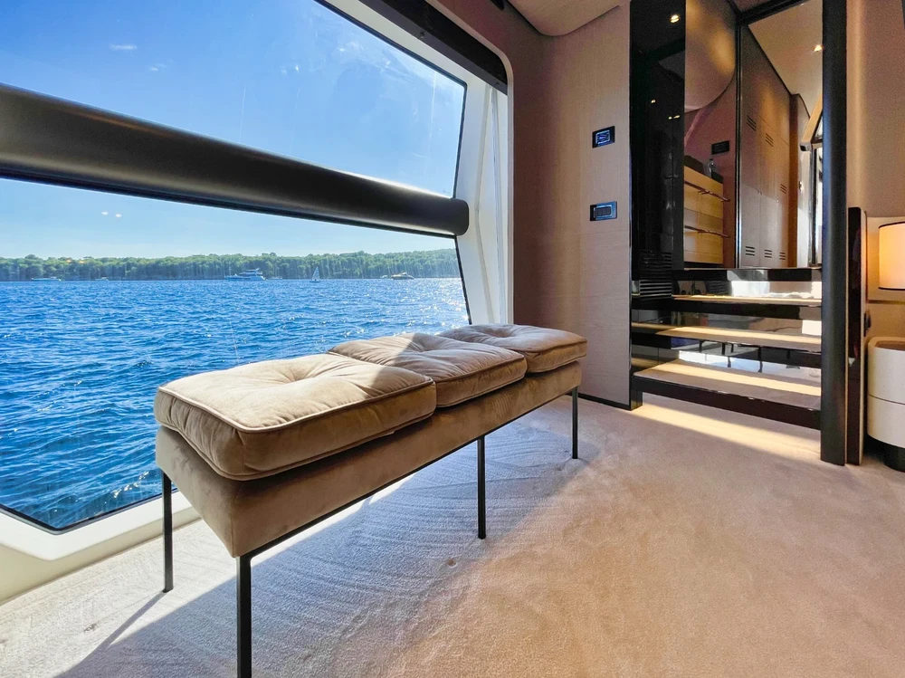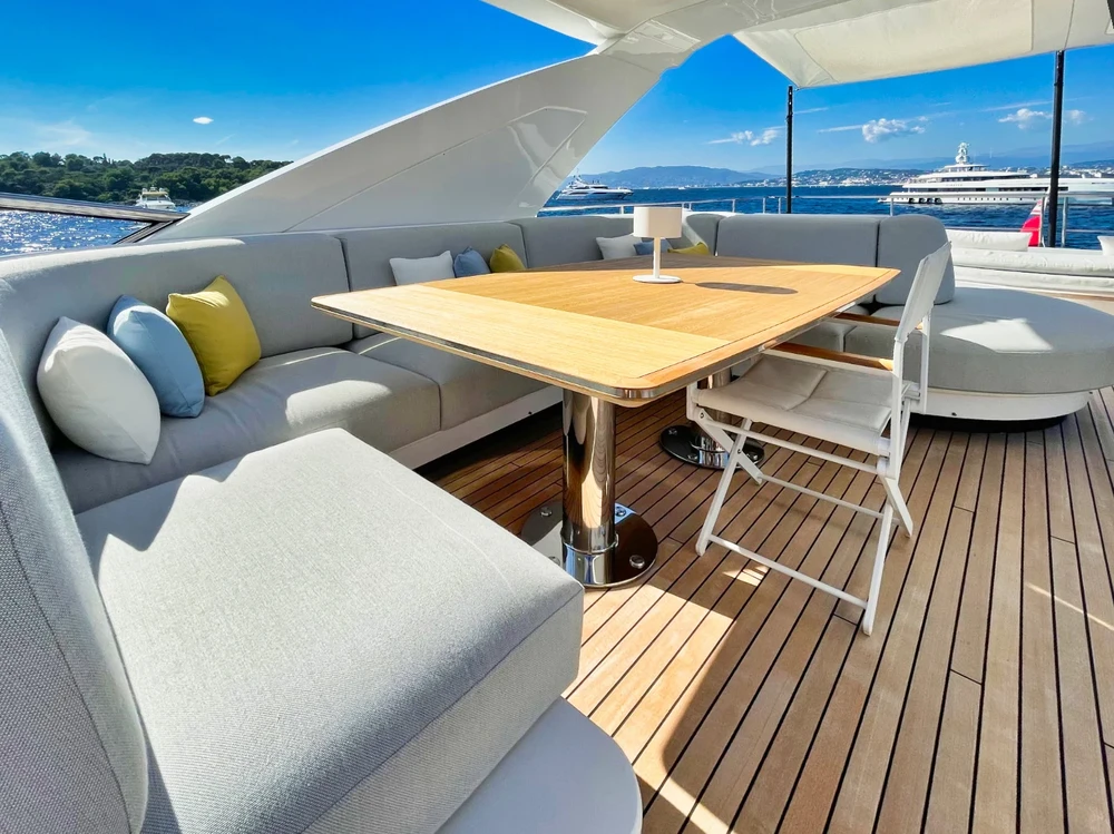The ample flybridge is shaded forward and amidships by the retractable sunroof, with the helm controls to starboard and a co-pilot seat adjacent. Amidships to port is the wet bar, and to starboard a C-shaped sofa and table make a desirable spot to sit back and savour the fresh air over drinks and a meal. The aft sofa arm curves around to create additional seating in the sunshine, and sun loungers look out over the stern for sweeping views of the surrounding