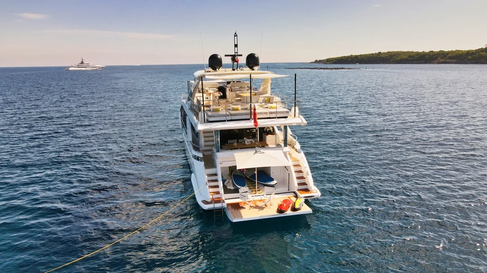 The main deck aft is fitted with a C-shaped sofa and raised alfresco dining table along the stern, with the rest of the space left clear for easy indoor/outdoor flow and exercise in the shade. Two stairways lead down to the lower deck swim platform and the tender garage, and a port staircase on the main deck aft connects to the flybridge above. The foredeck dining and sunbathing area is accessed via the side walkways past the interior salon.