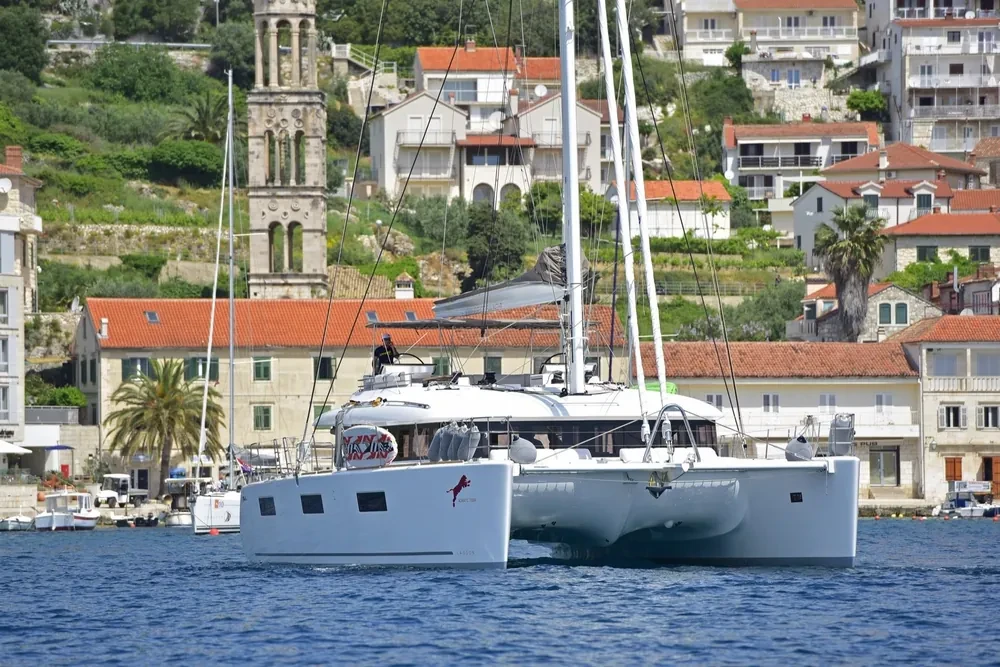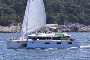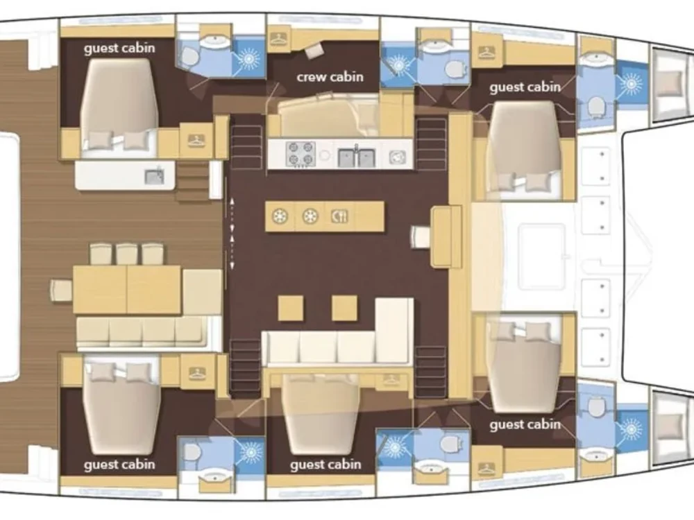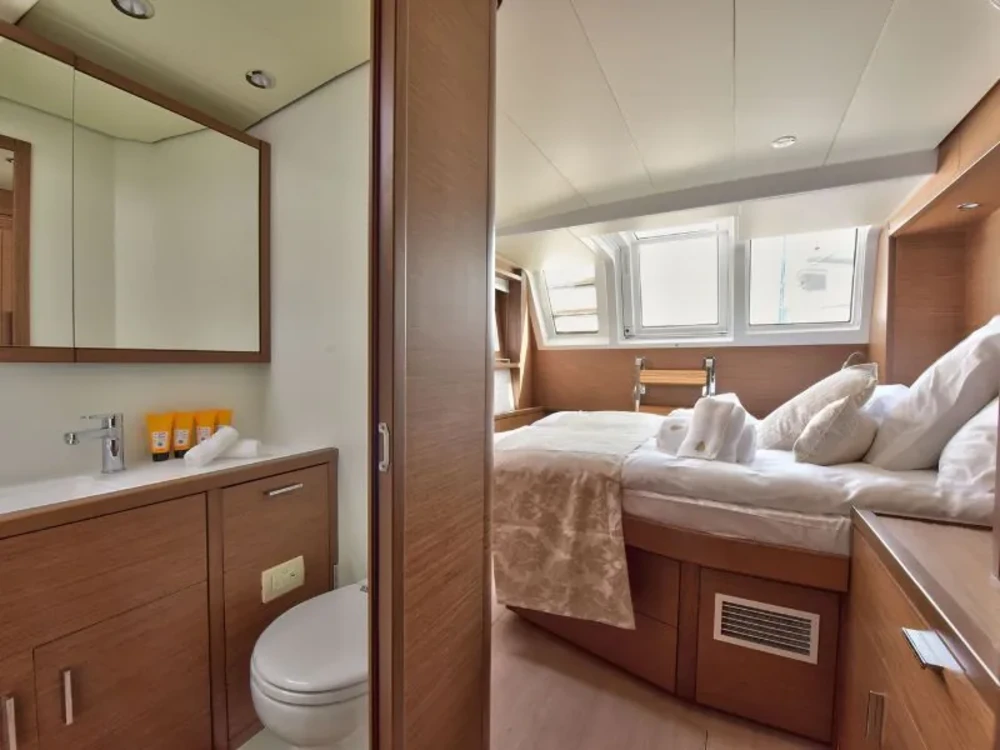 Exceptional living space, both above and below deck choice of 5 queen size bed en-suite cabins in which can sleep up to 10 guests. Crew has their separate quarters This powerful deep-water catamaran combines the outstanding comfort of a luxurious houseboat with excellent performance, both under sail and engine power. Lagoon 620, available for charter in Croatia, has 5 queen size berth cabins (sleeps up to 10 guests), all en-suite, plus separate cabins for three professional crew members.