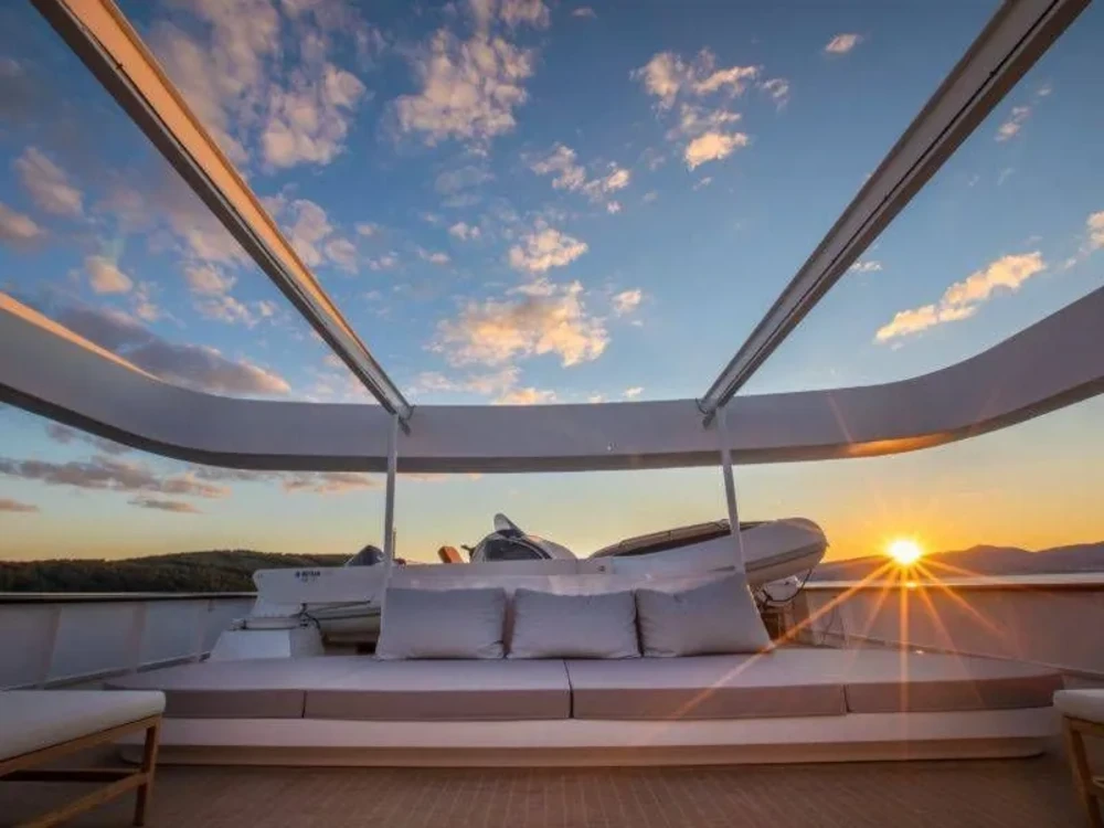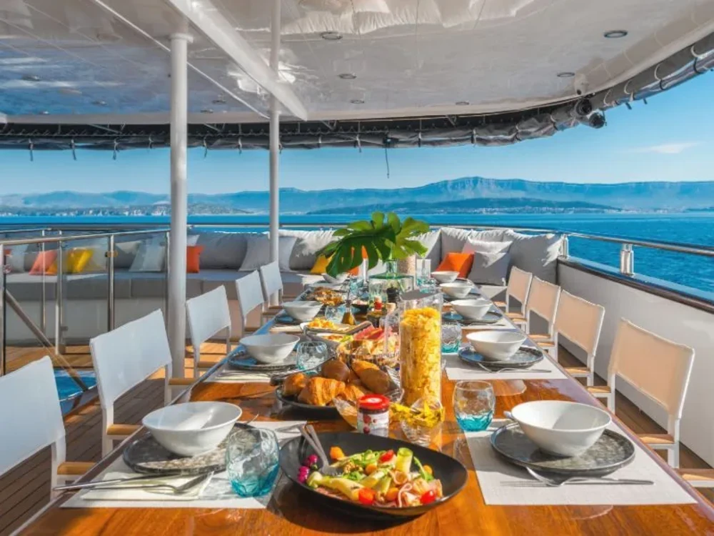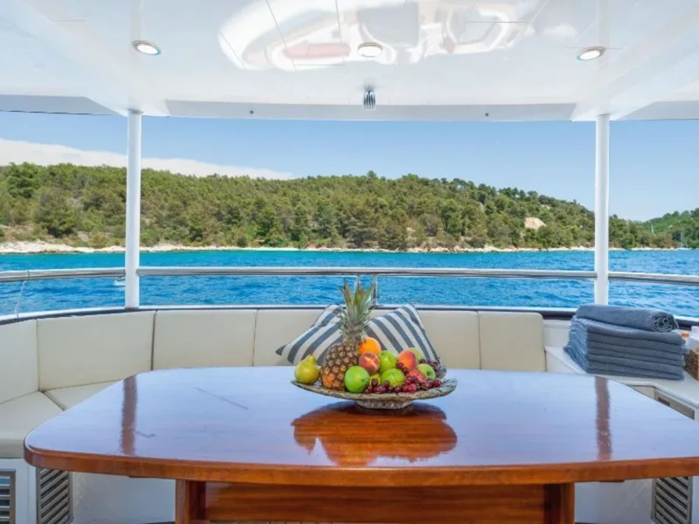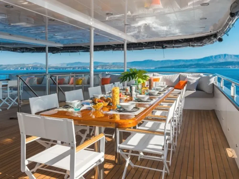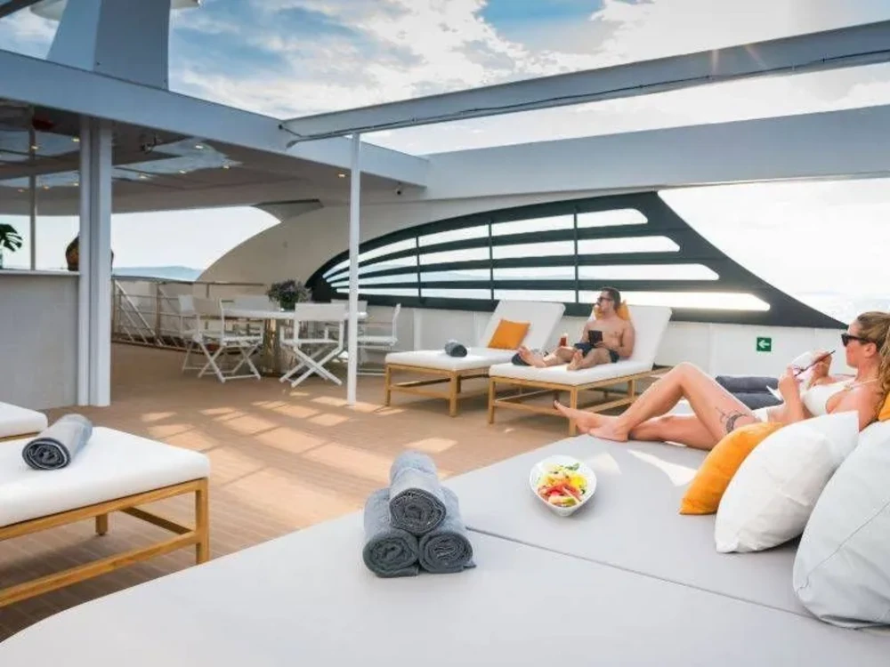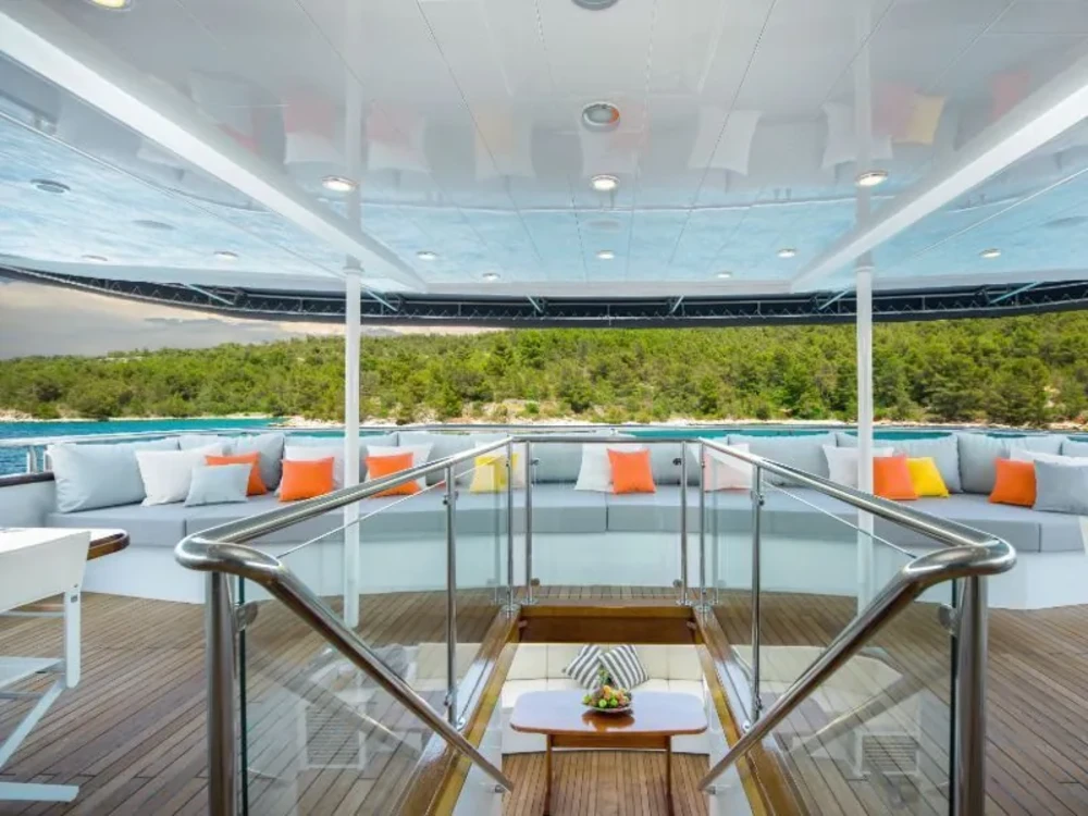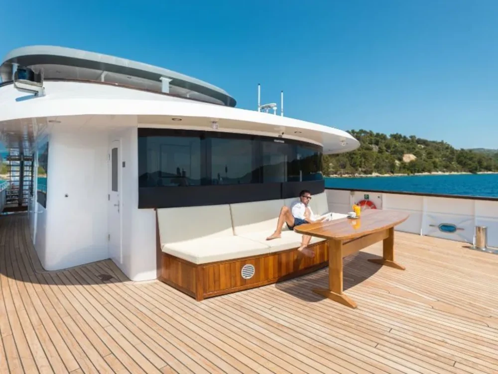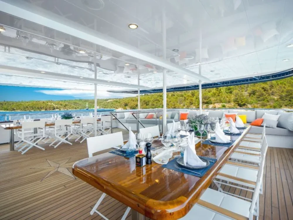 Hard top, Outside speakers, Deck with dining area, Indoor dining, Minibar outside, Separate cabins for cews, Sun Mattresses, Hot water, Summer tent, Eletrical fridge-fly, Towels