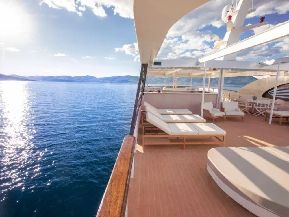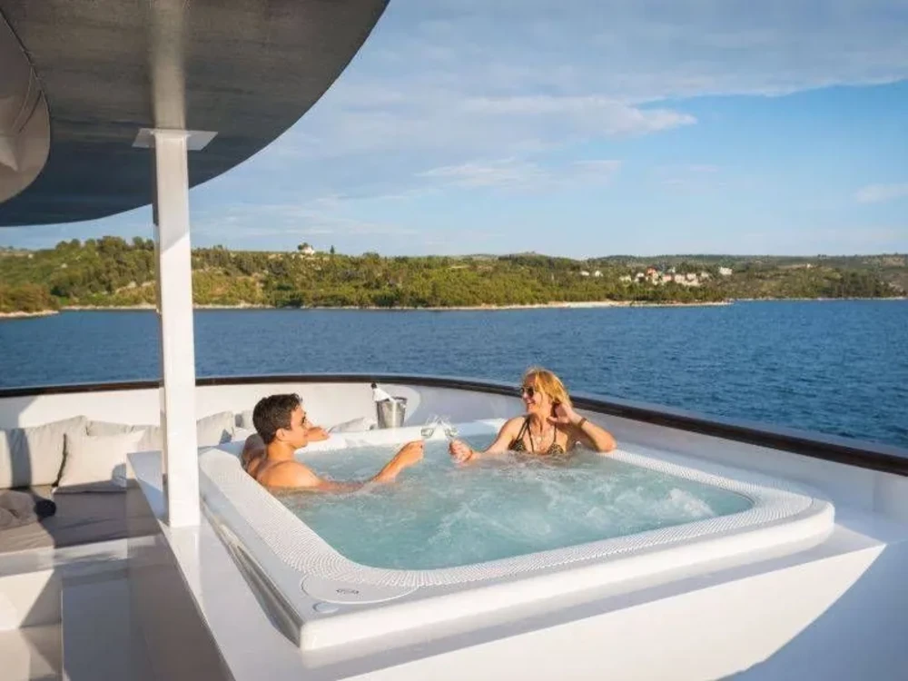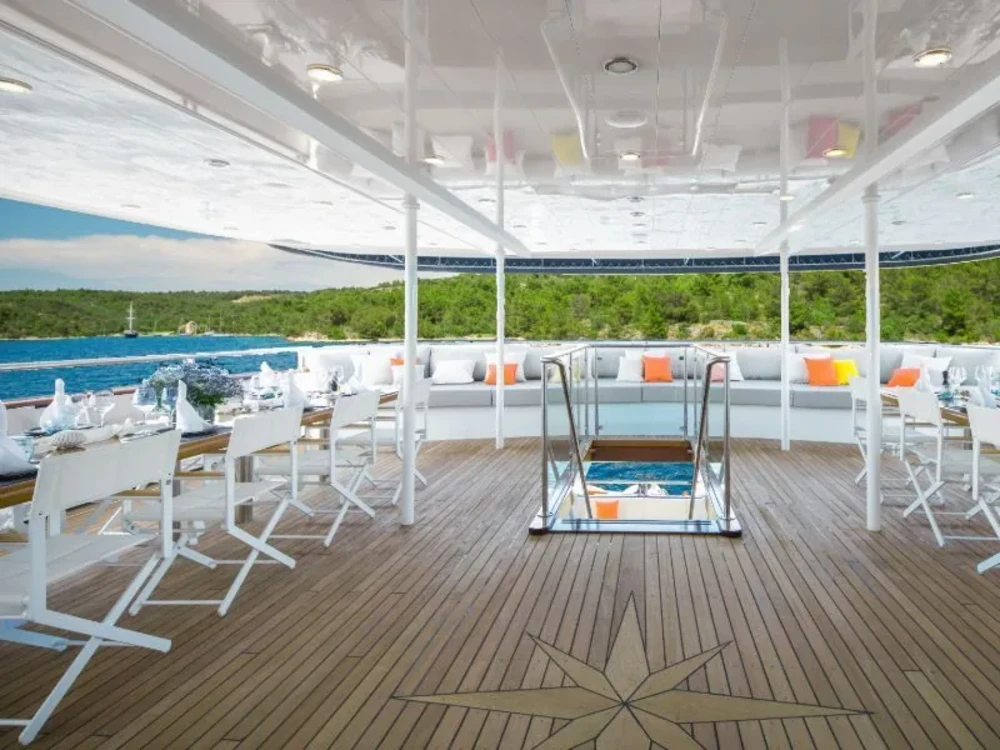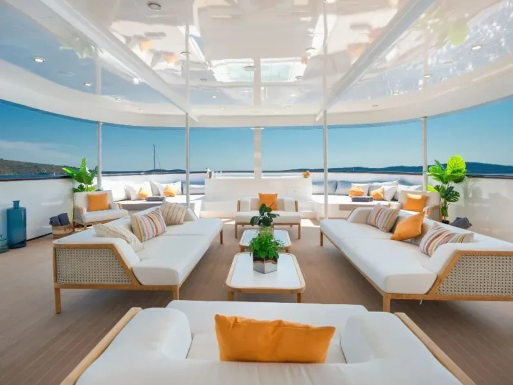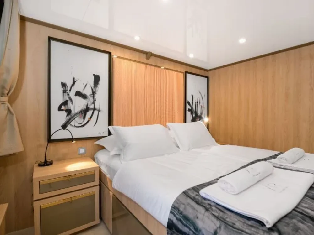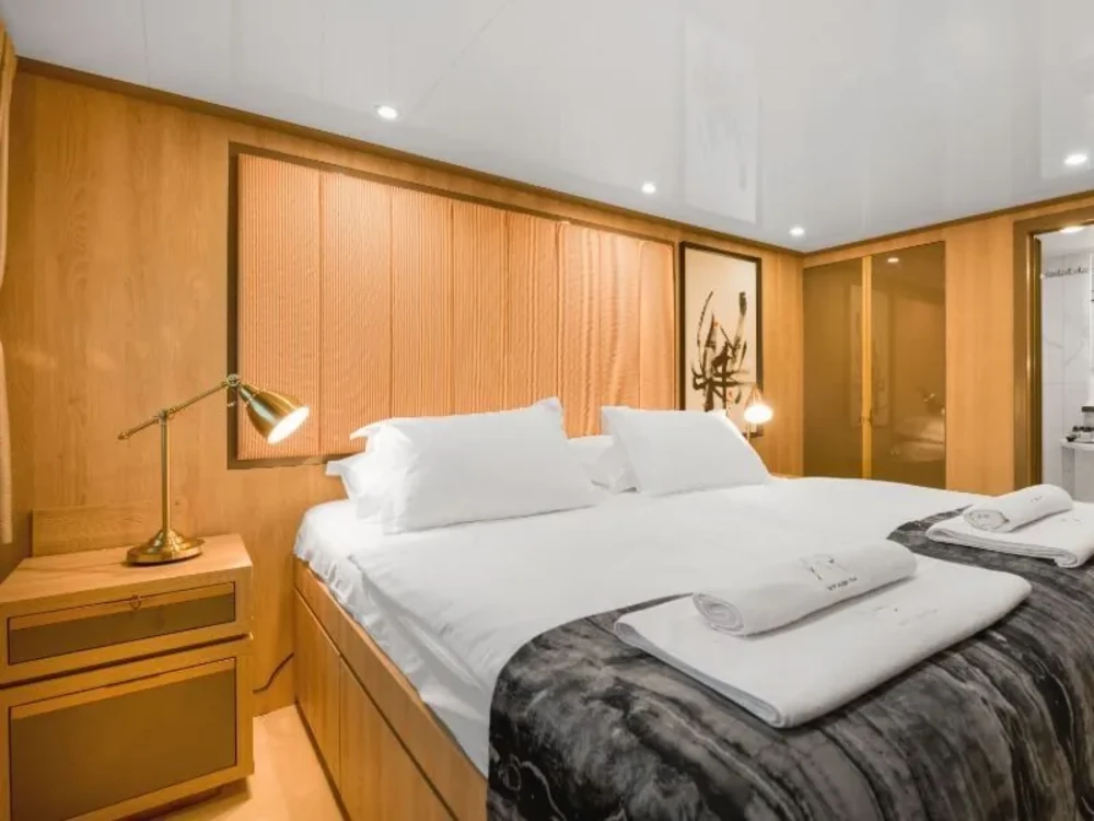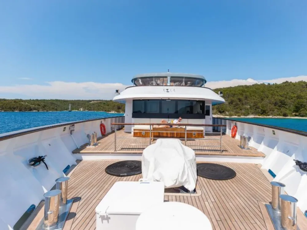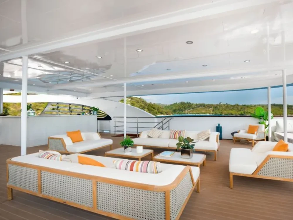 Hard top, Outside speakers, Deck with dining area, Indoor dining, Minibar outside, Separate cabins for cews, Sun Mattresses, Hot water, Summer tent, Eletrical fridge-fly, Towels