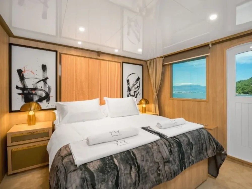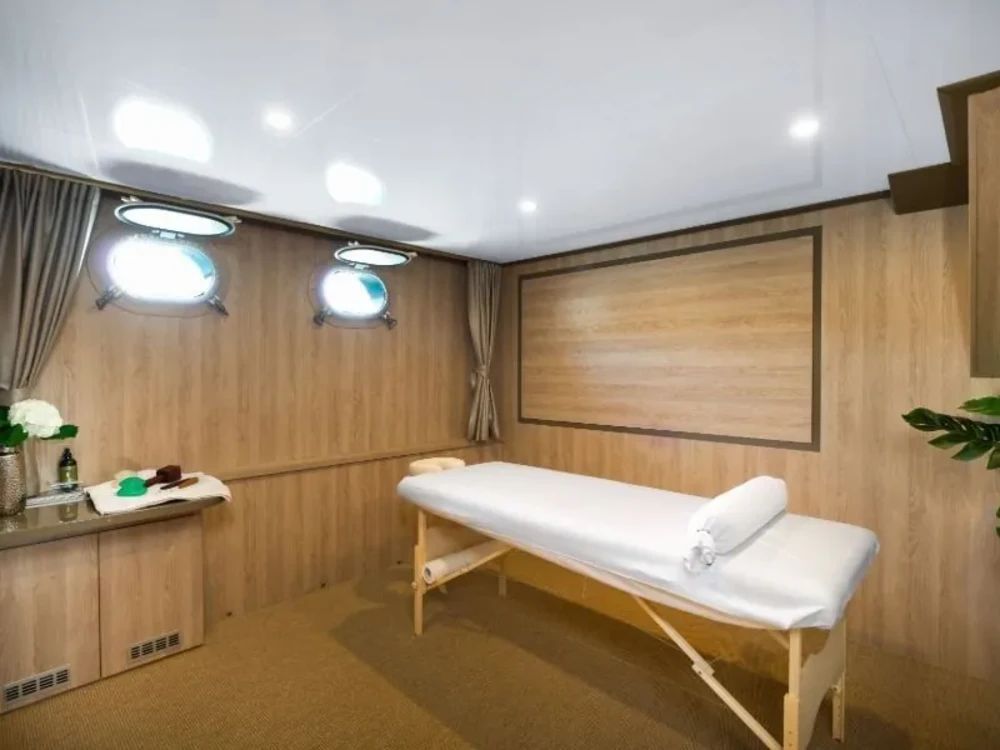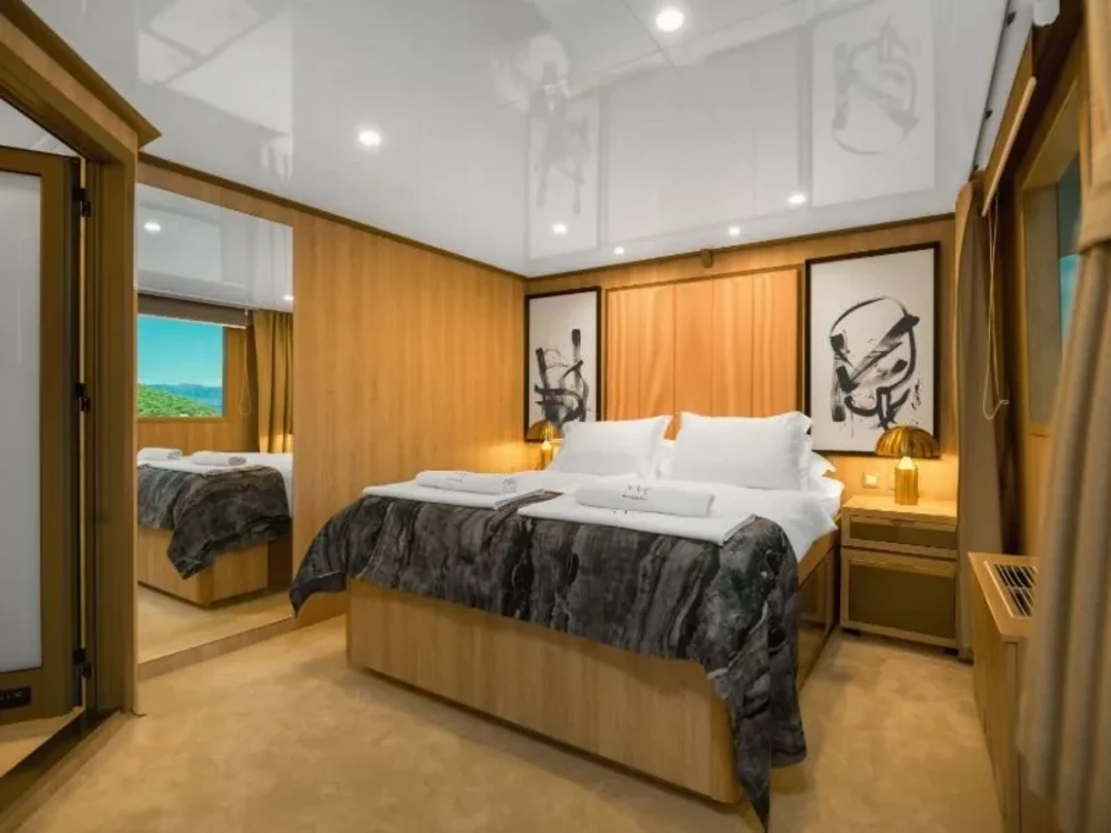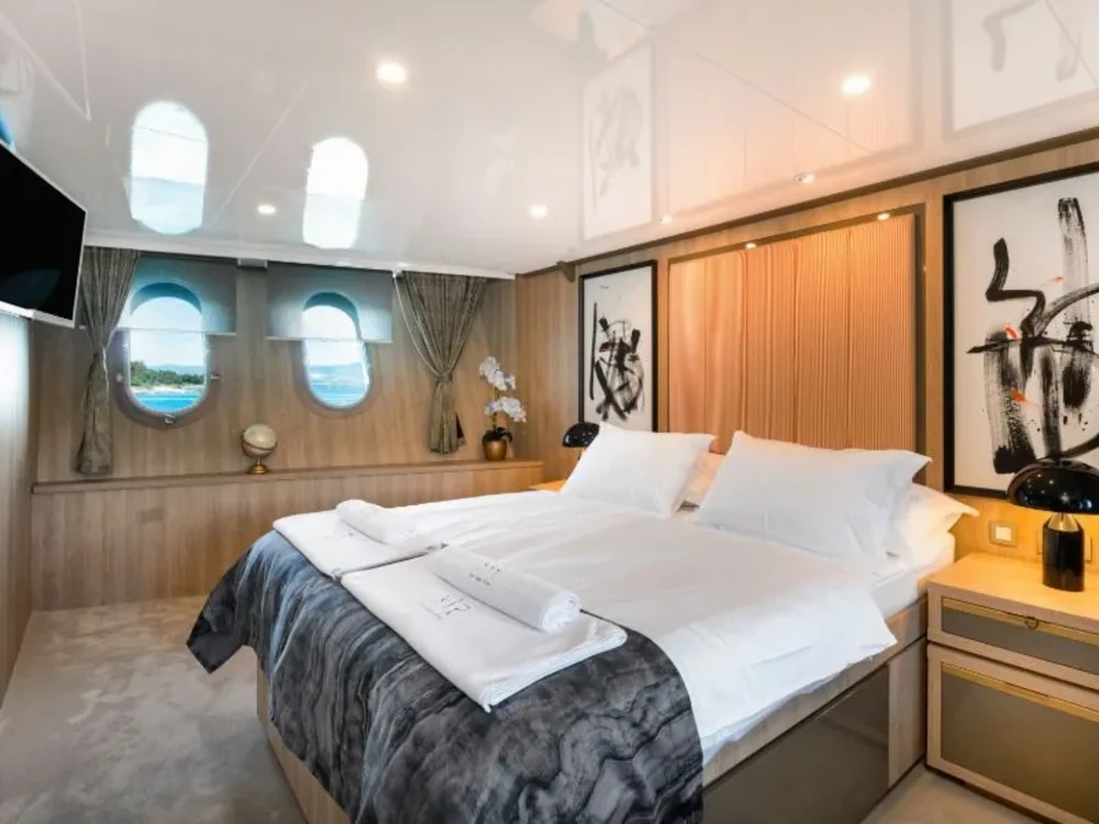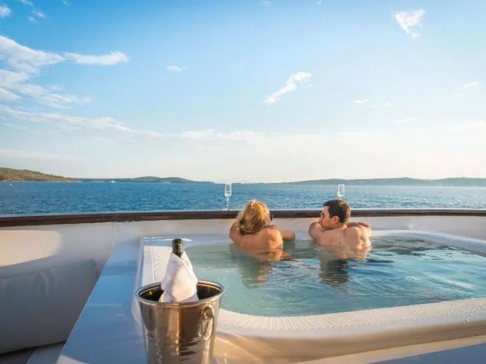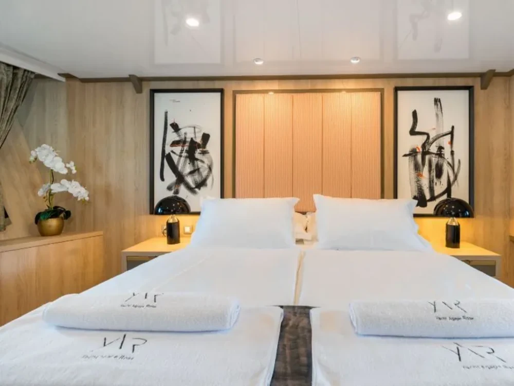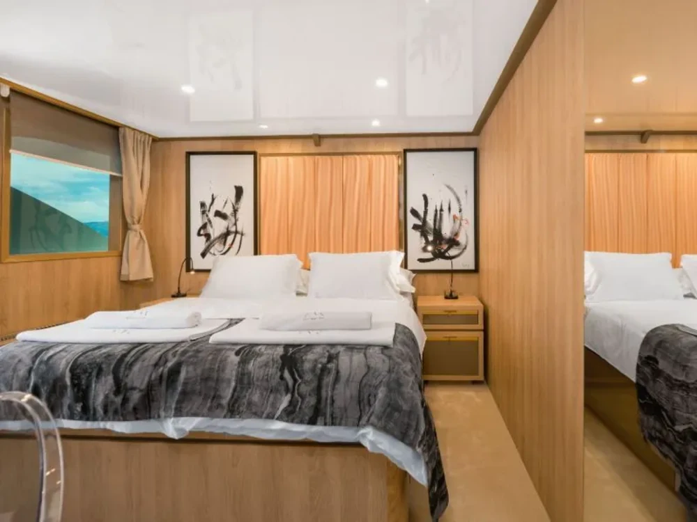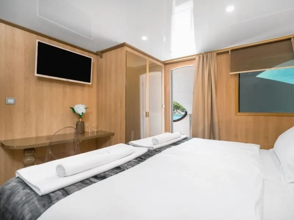 Hard top, Outside speakers, Deck with dining area, Indoor dining, Minibar outside, Separate cabins for cews, Sun Mattresses, Hot water, Summer tent, Eletrical fridge-fly, Towels