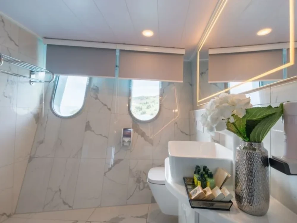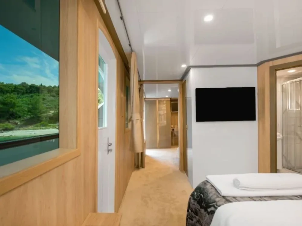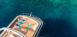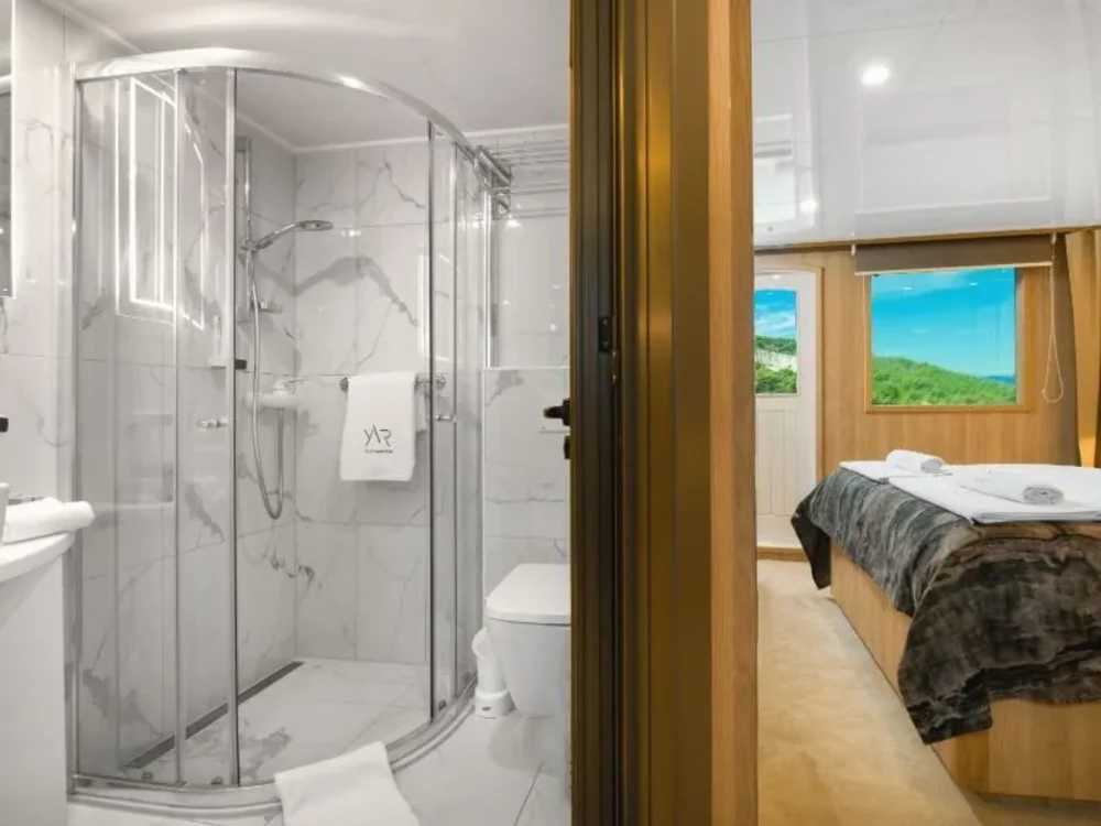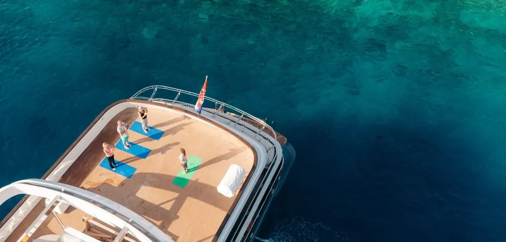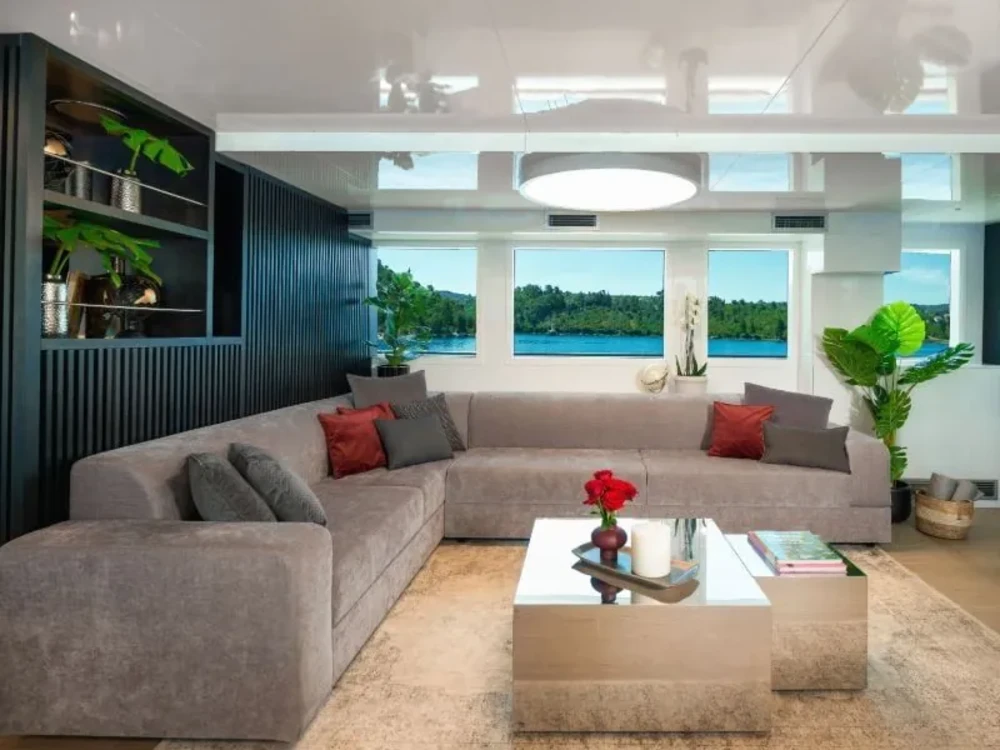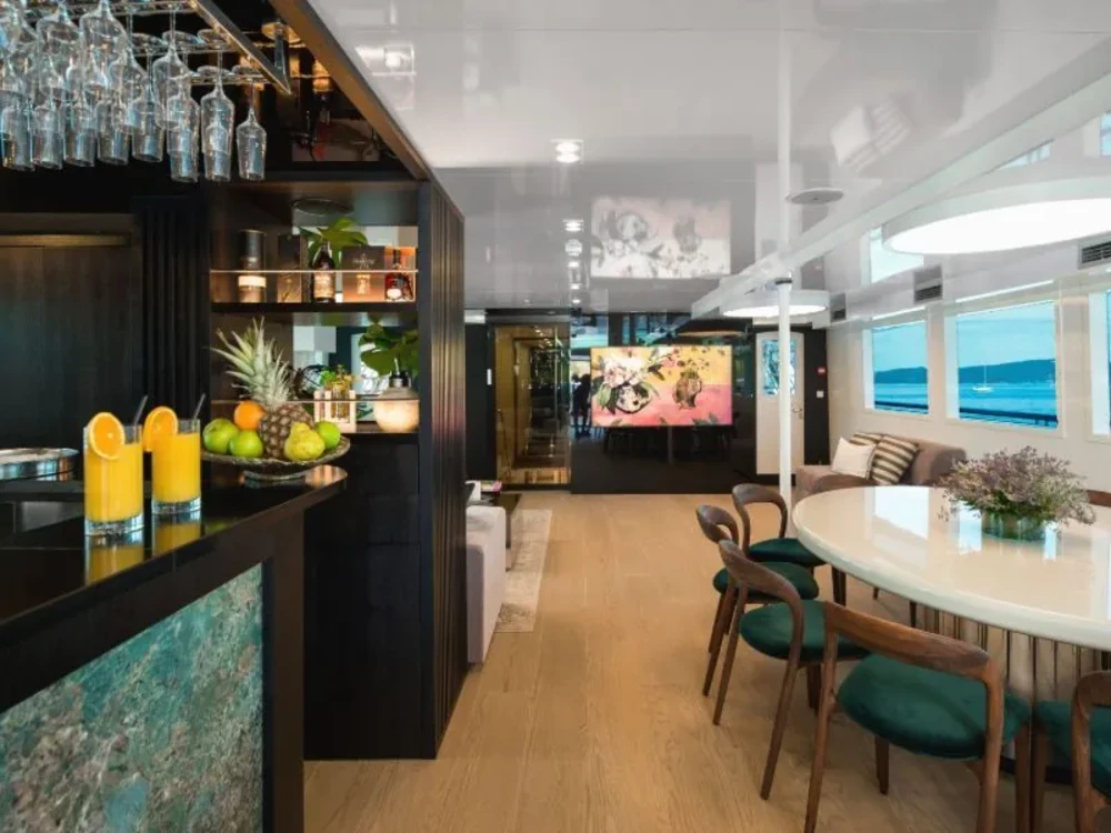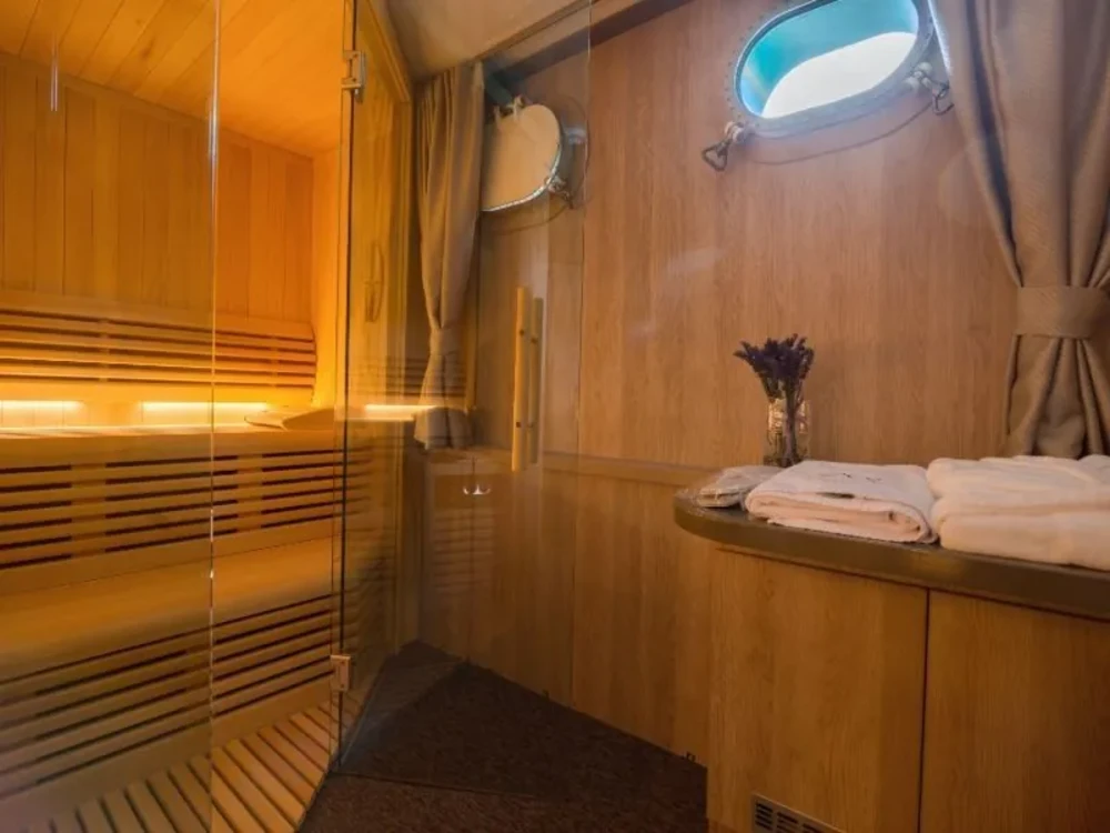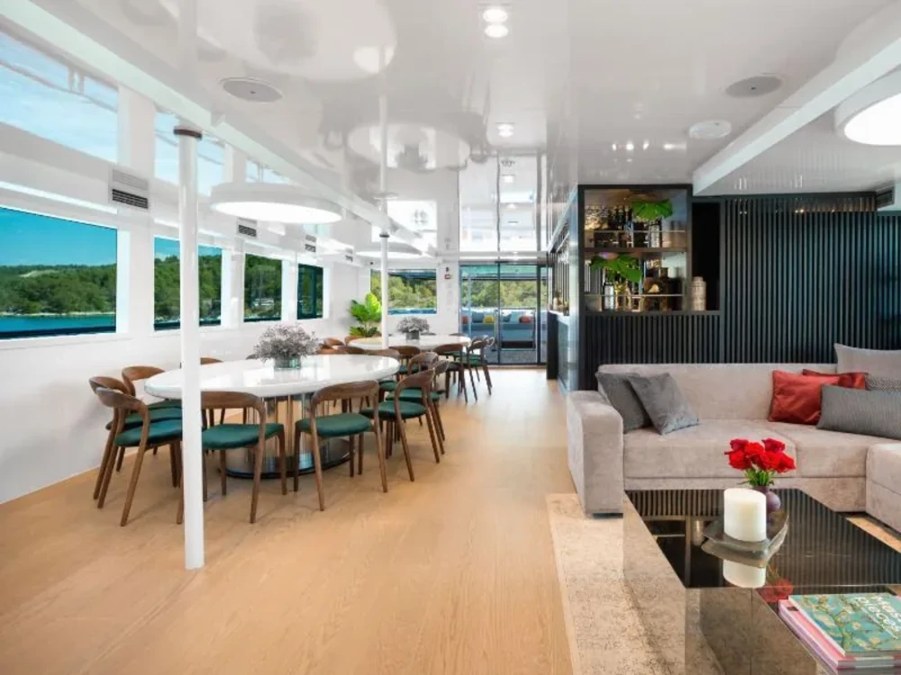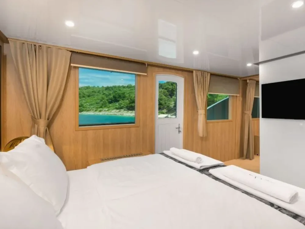 Hard top, Outside speakers, Deck with dining area, Indoor dining, Minibar outside, Separate cabins for cews, Sun Mattresses, Hot water, Summer tent, Eletrical fridge-fly, Towels