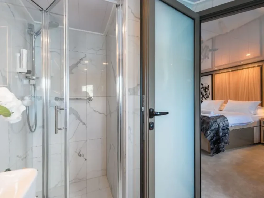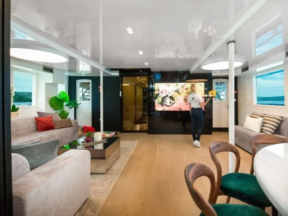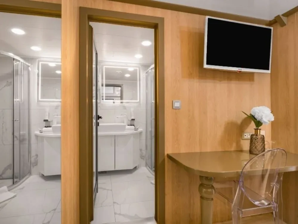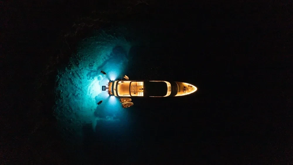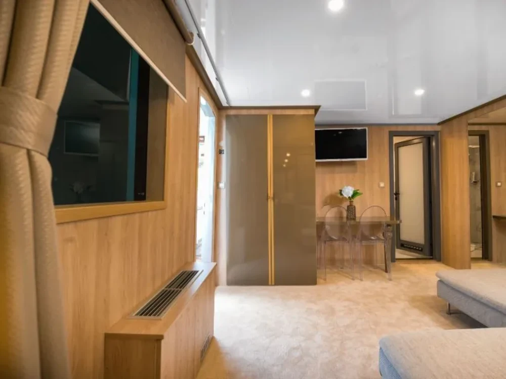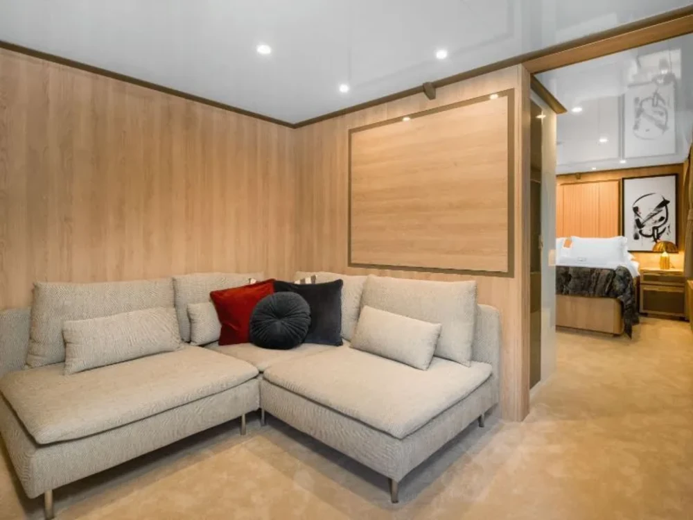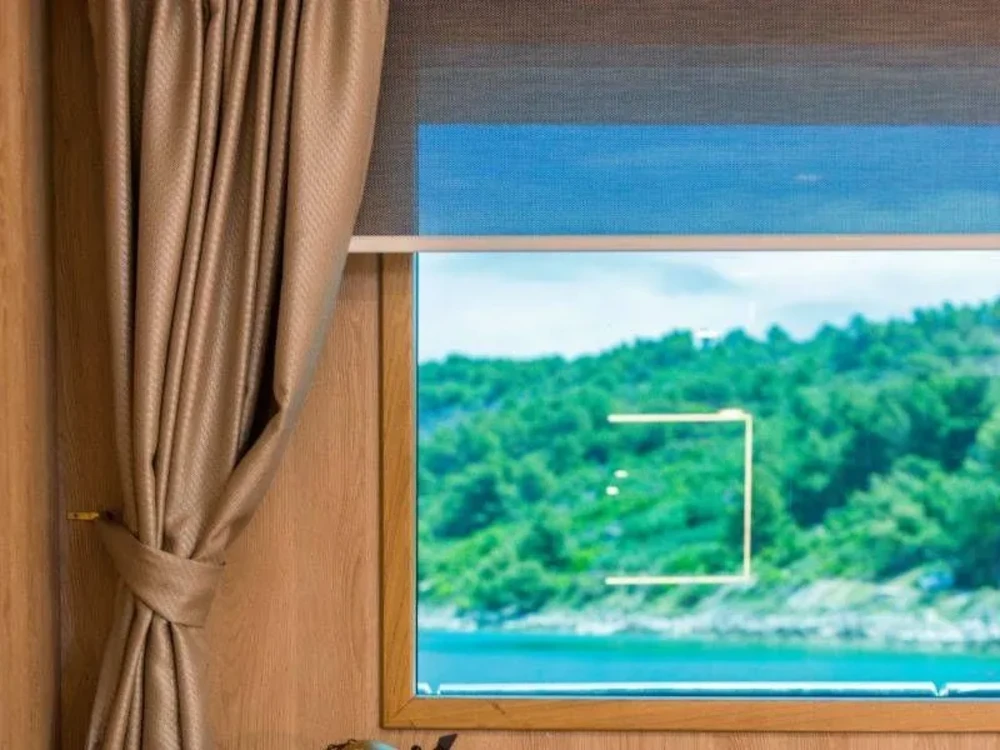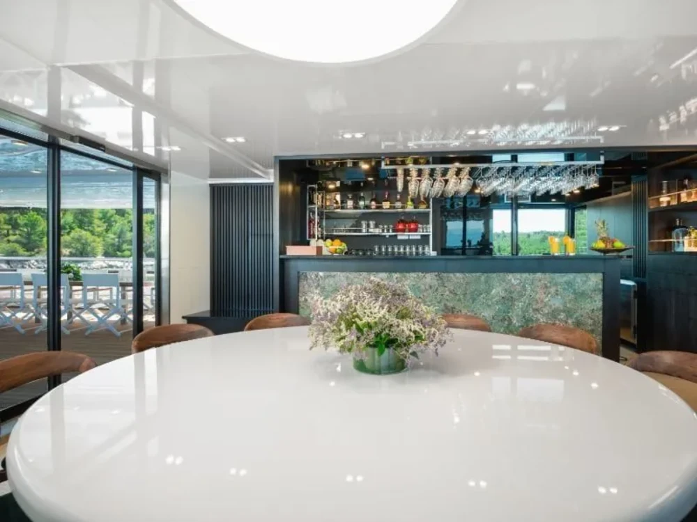 Hard top, Outside speakers, Deck with dining area, Indoor dining, Minibar outside, Separate cabins for cews, Sun Mattresses, Hot water, Summer tent, Eletrical fridge-fly, Towels
