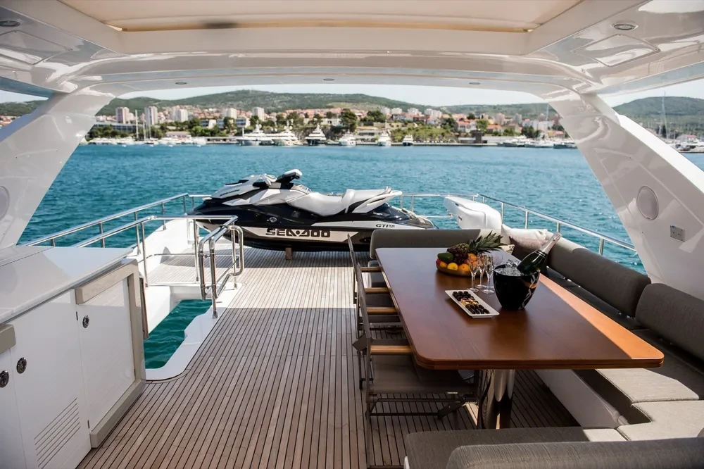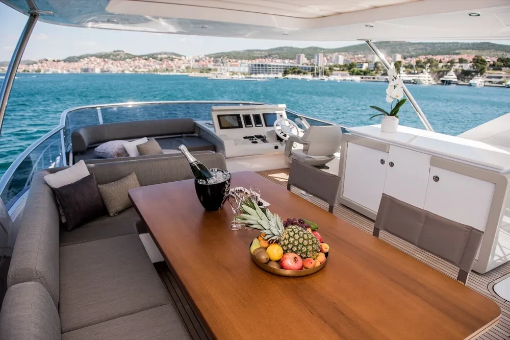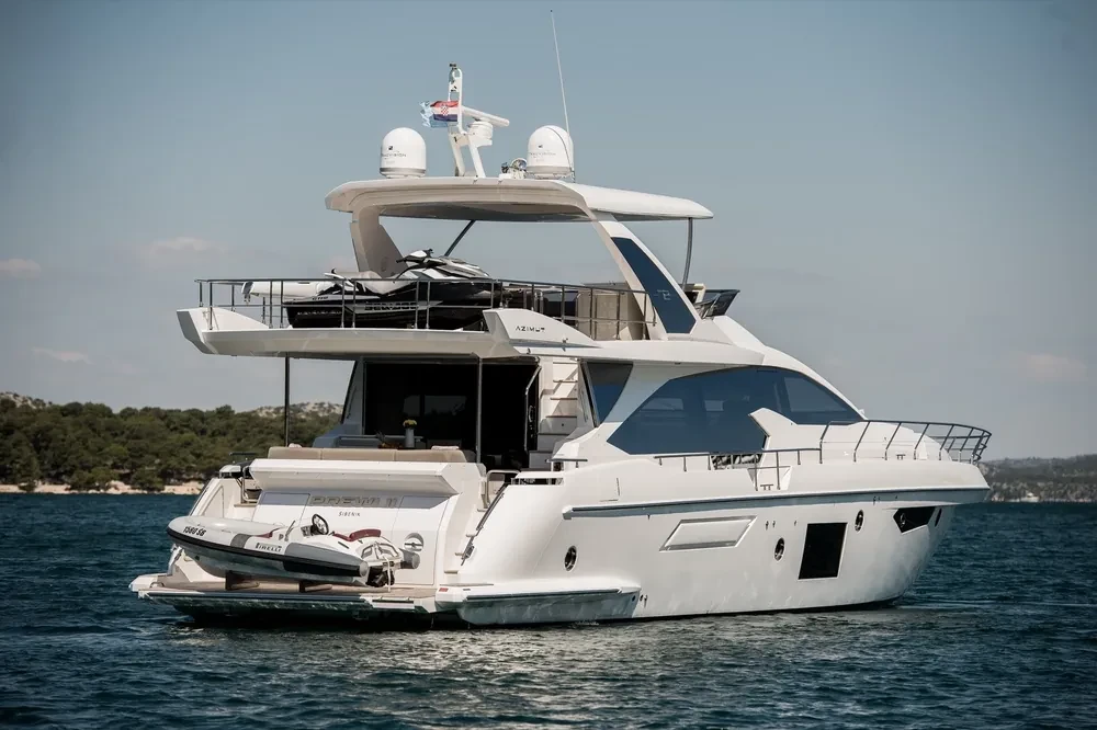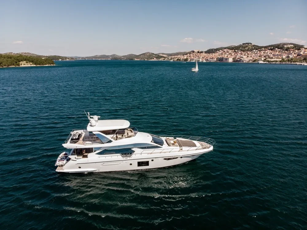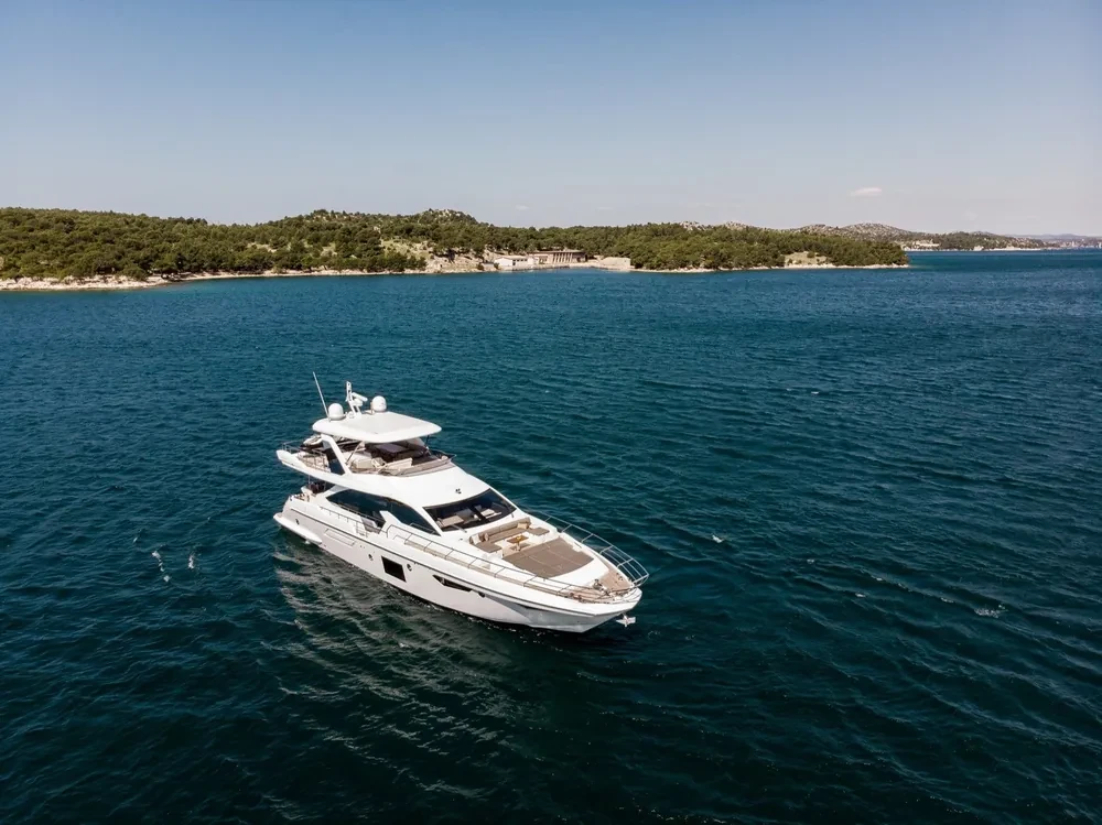 Alyss is a motor yacht that stands for comfort and performance. She has an overall length of 23 meters and four comfortable cabins with a capacity for eight people. She has bow thrusters, Wi-Fi, speakers, air conditioning and a swim platform to combine luxury and entertainment. The 2 x MAN V12 1400HP offer excellent speed and performance on the water. The Azimut 72 Fly is simply perfect if you want to spend your holiday on a charter yacht in Croatia. A professional crew consisting of captain and hostess will take care of the guests in every way.