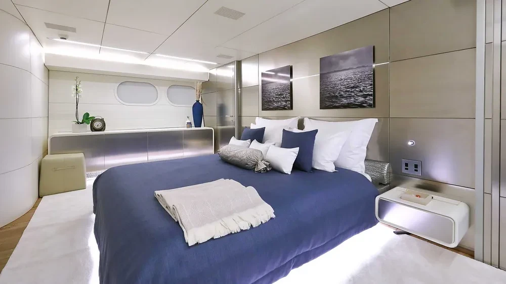 The Interior is characterized by a palette that includes an elegant mix of shades grey that recalls the colour of the exterior and blend well to honey- colored wood floors 100 years-old oak Matt White ceilings and walls. The plush sofa of the living room made with fine leathers and fabrics from the darker colours create a pleasant contrast effect. The dining area has a basic aluminium table which can accommodate 8 people. The four cabins are all equipped with private bathrooms and closets area Separate galley and crew mess.