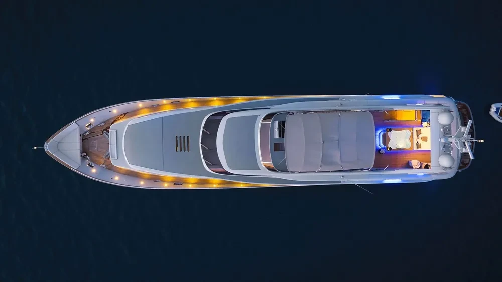 Rigorous and essential lines of the Interior gives this boat a unique style that employs essential materials such as titanium and lacquer paints. The Interior is characterized by a palette that includes an elegant mix of shades grey that recalls the color of the exterior and blend well to honey–colored wood floors 100 years–old oak Matt White ceilings and walls. The plush sofa of the living room made with fine leathers and fabrics from the darker colors create a pleasant contrast effect.