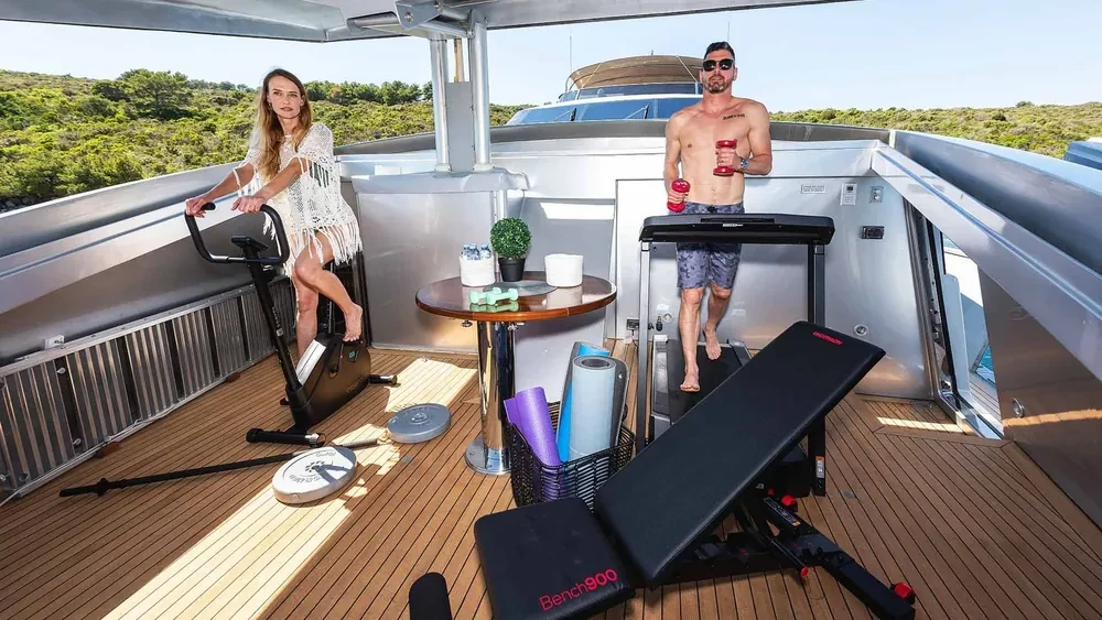 Outside speakers, Minibar outside, Separate cabins for cews, Sun Mattresses, Coffee machine, Oven, Towels