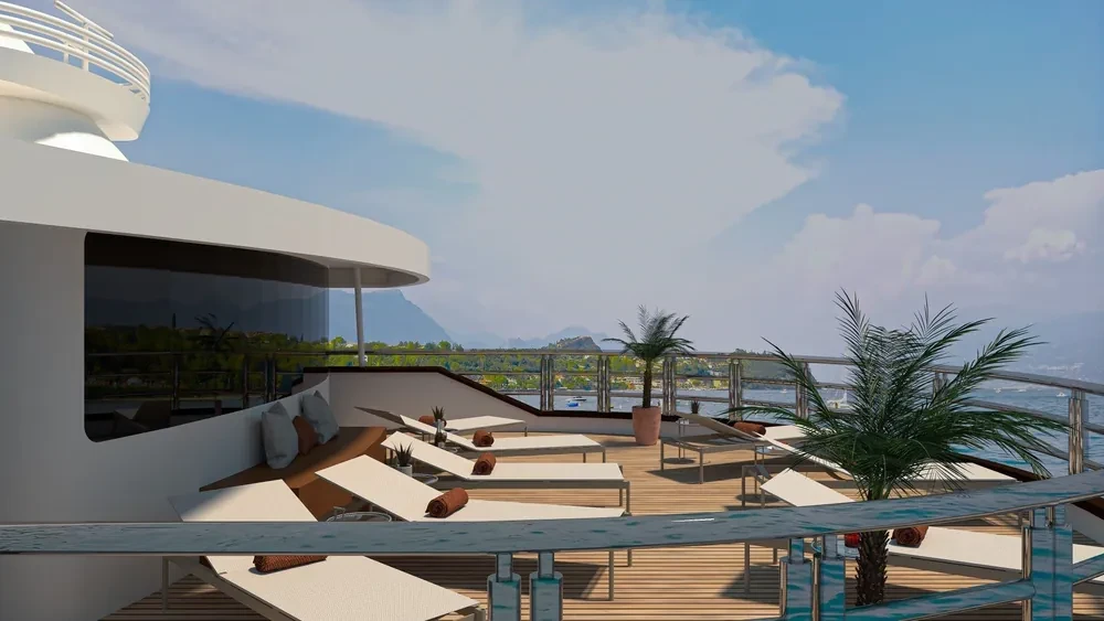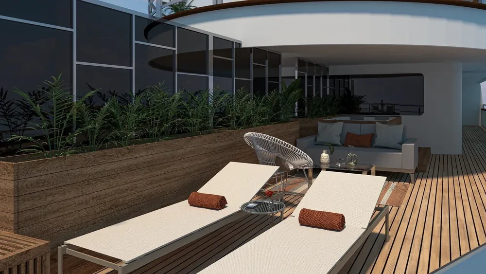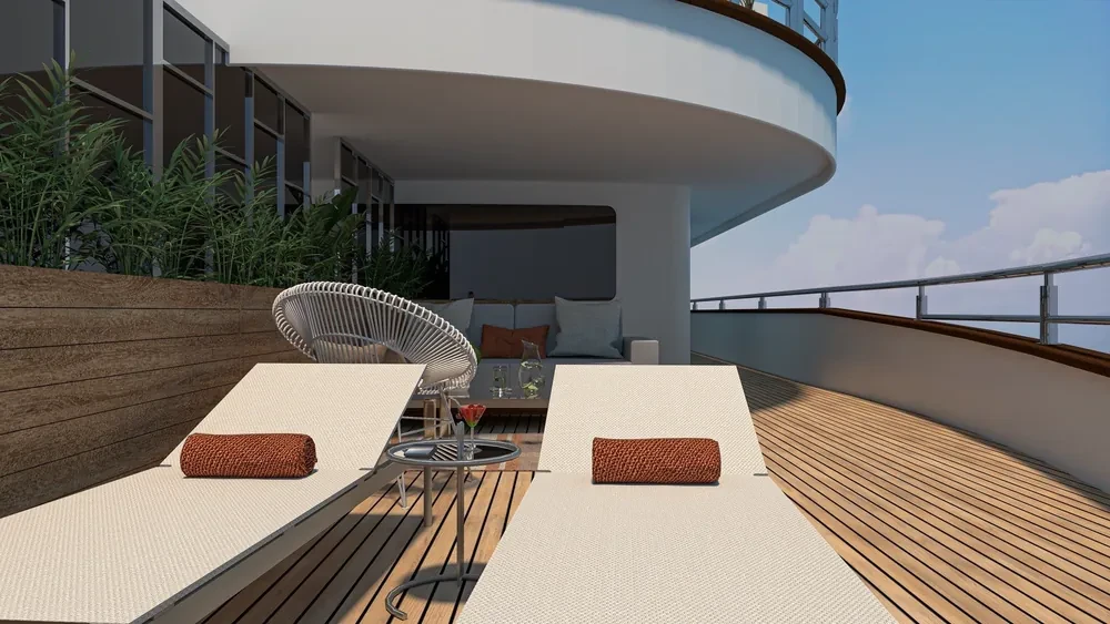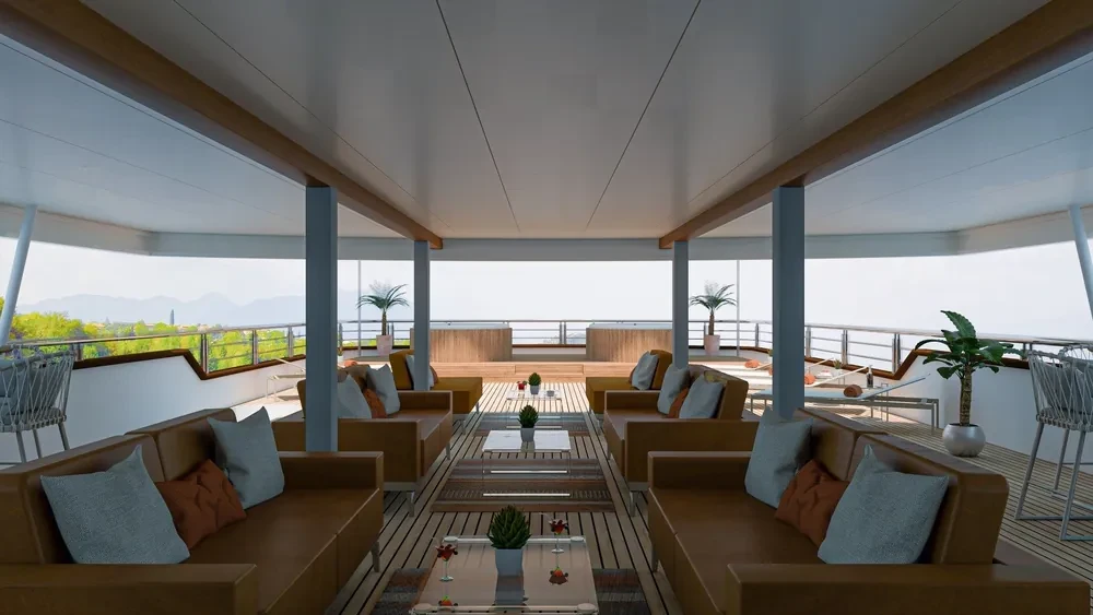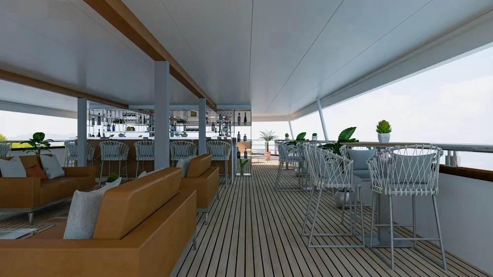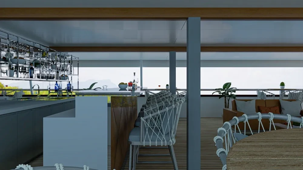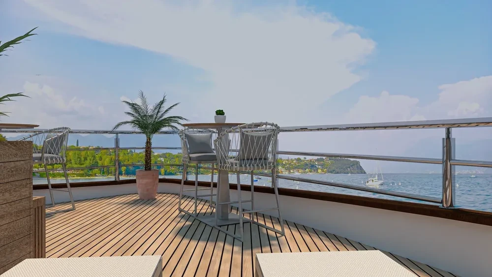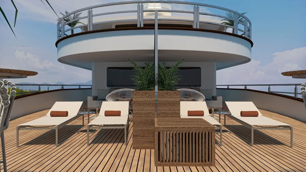 Deck with dining area, Indoor dining, Minibar outside, Separate cabins for cews, Sun Mattresses
