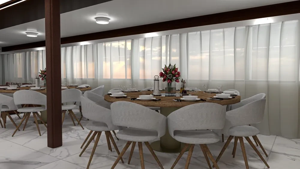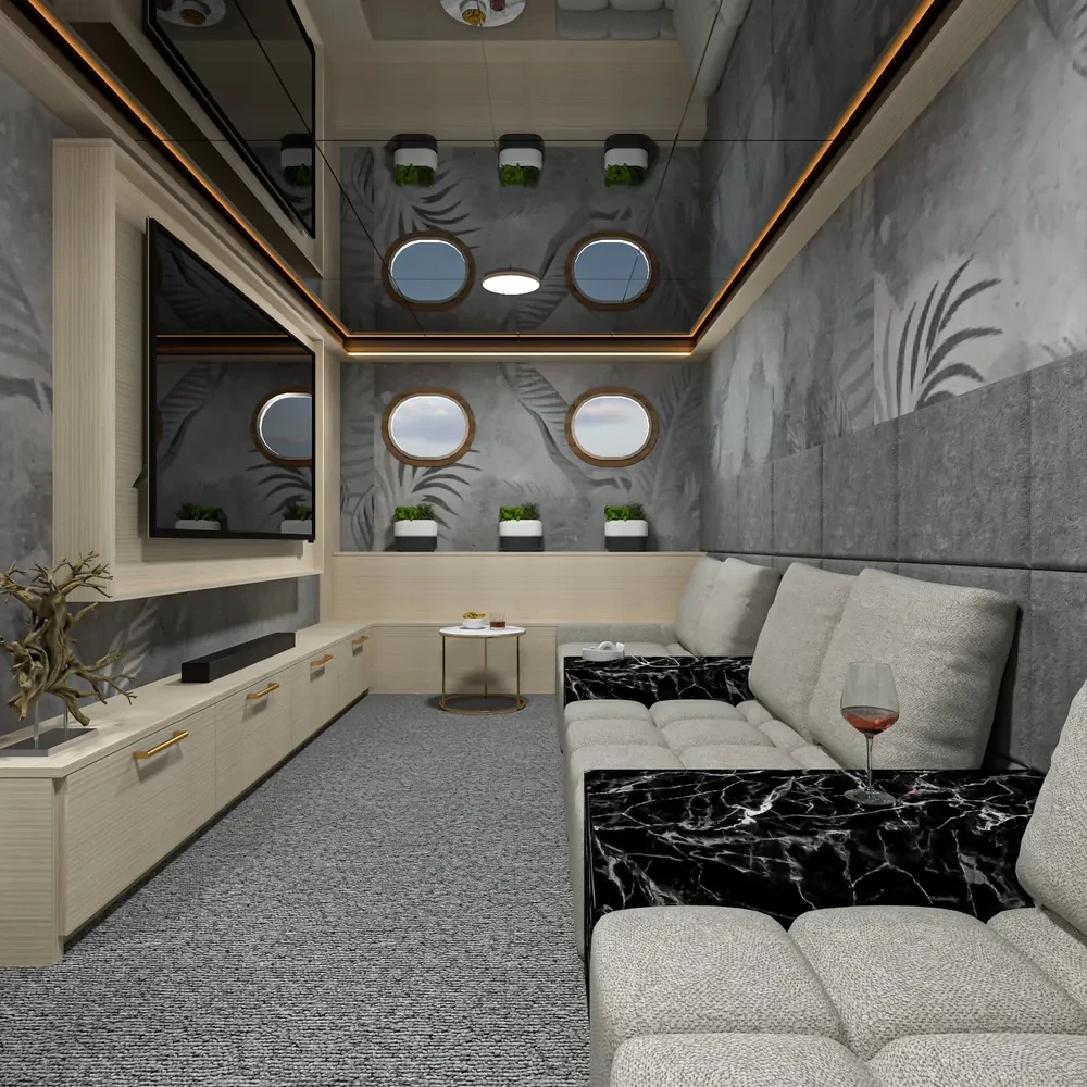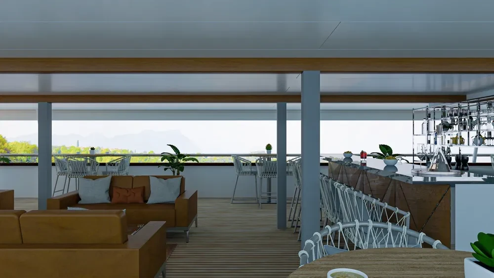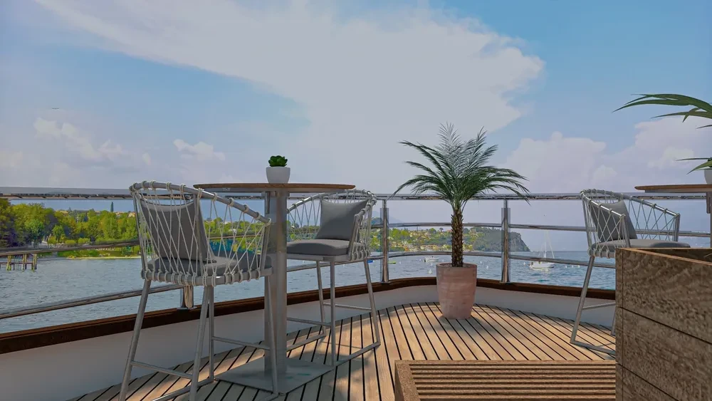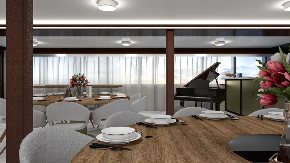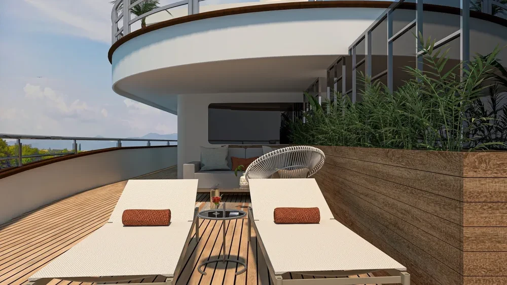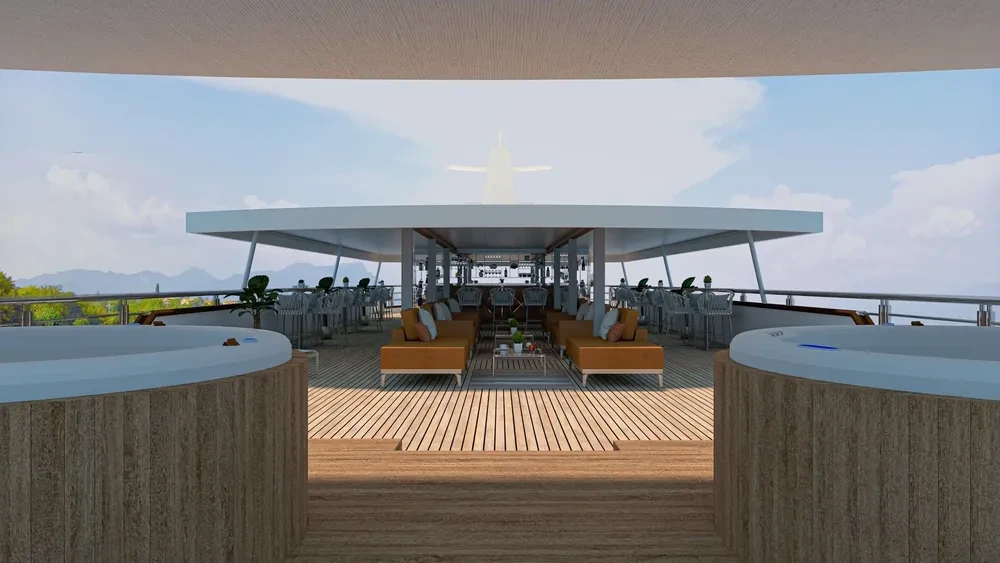 Deck with dining area, Indoor dining, Minibar outside, Separate cabins for cews, Sun Mattresses