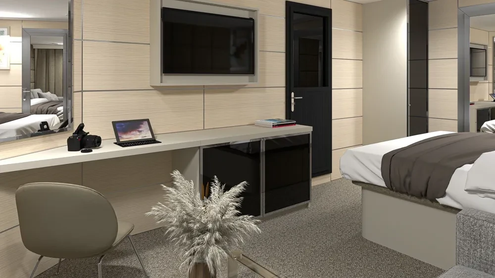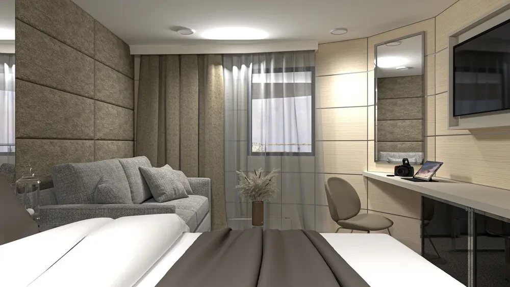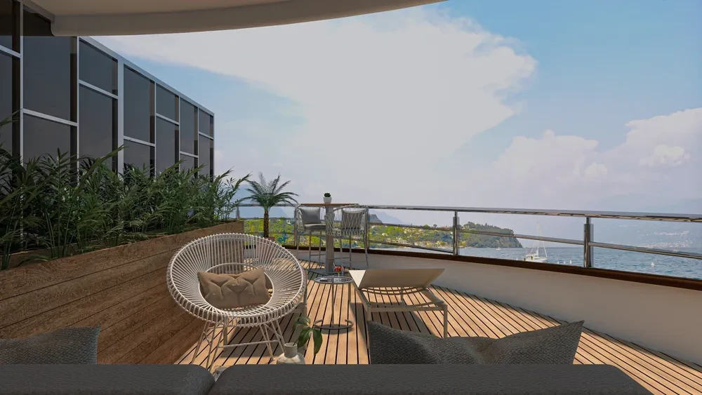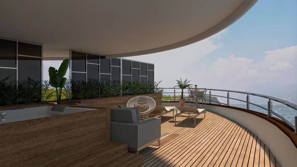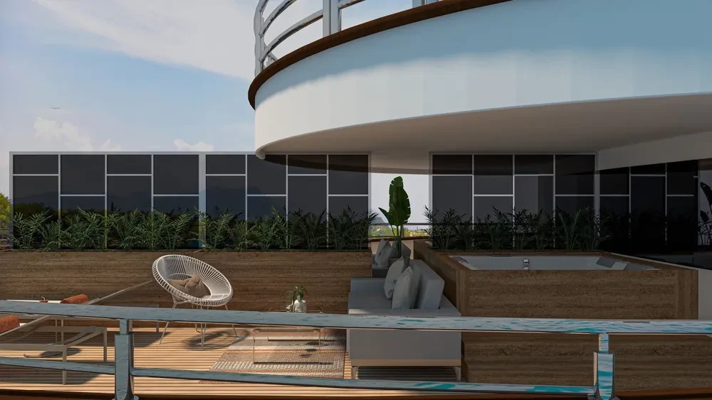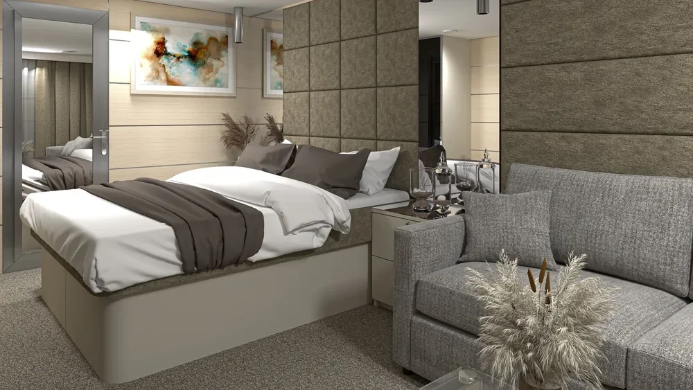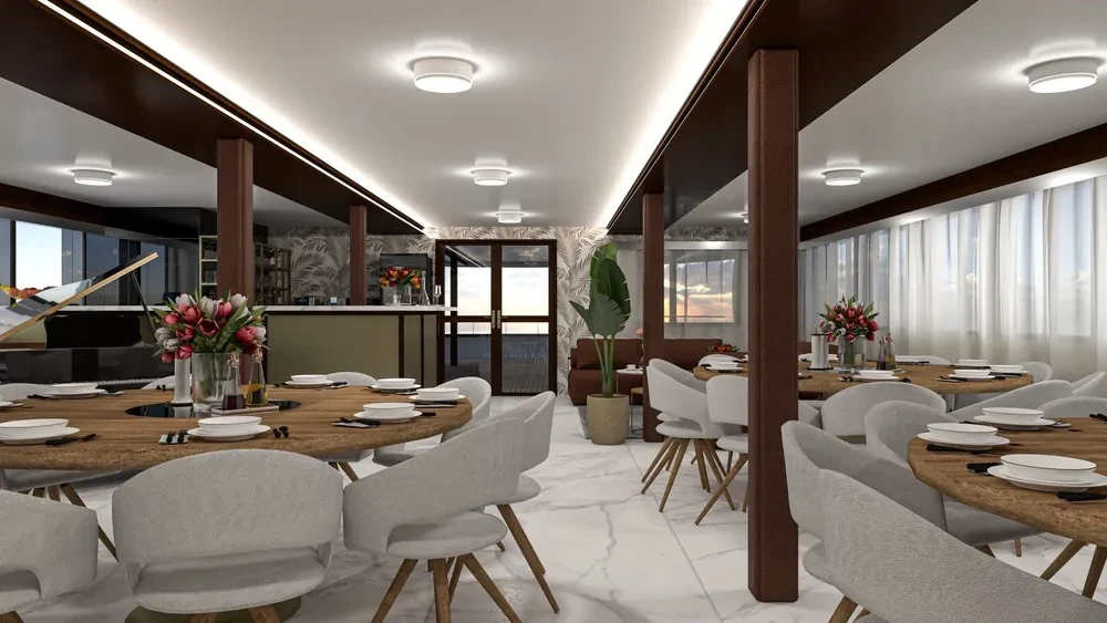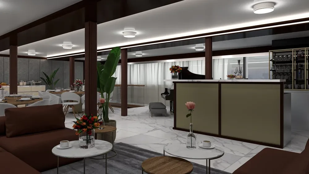 Deck with dining area, Indoor dining, Minibar outside, Separate cabins for cews, Sun Mattresses
