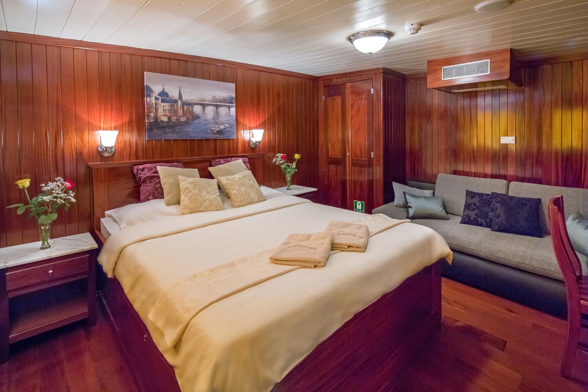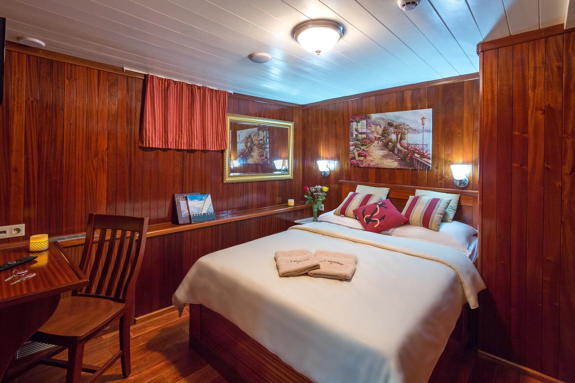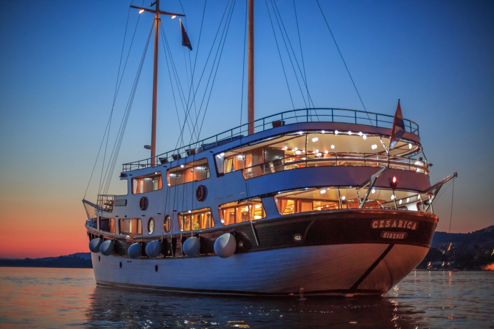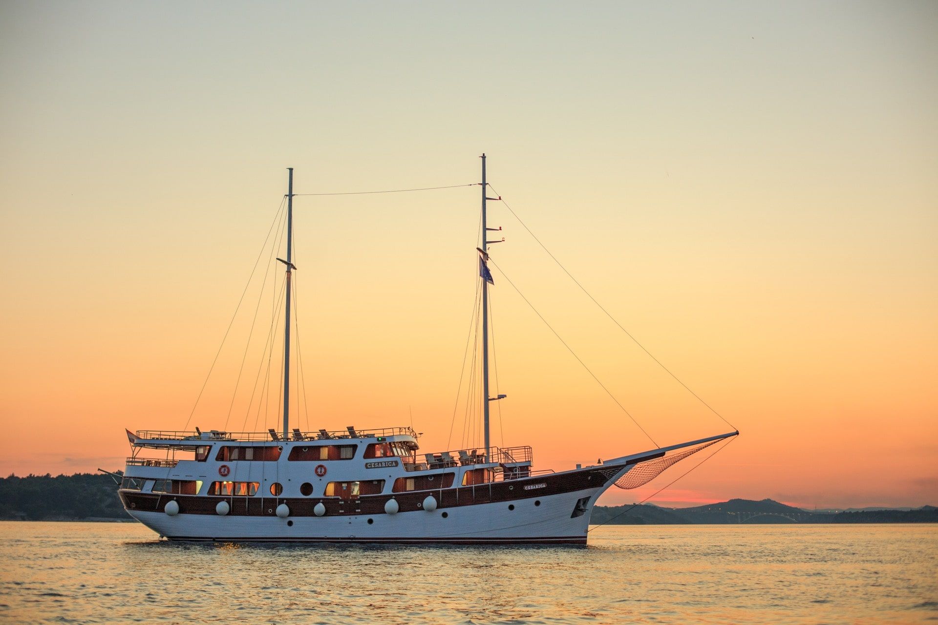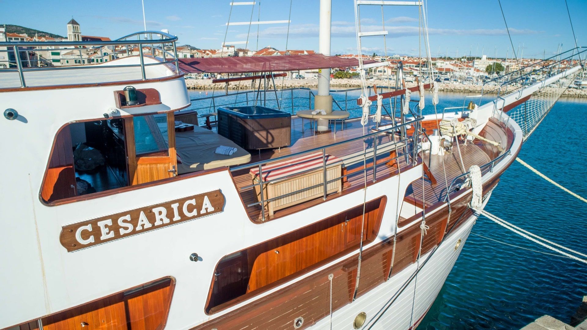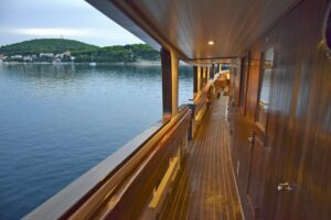 When Cesarica was just a dream, she was envisioned as a luxury yacht not yet seen in Croatia at the time, a completely wooden luxury motor sailing yacht with comfort of the passenger in mind. The vision was to build a large boat with a small number of cabins for its size to accommodate just the right number of guests where each guest can feel appreciated and attended to. Cesarica has a small boat feel with the luxury of a yacht. It was constructed with the highest quality materials such as teak, mahogany, and oak, which give it an old-world feel yet the granite, marble and stainless steel give it a modern elegant look. The cabins are spacious but charming and tastefully decorated. The kitchen is large and of restaurant quality where the chef will be able to create fresh Croatian specialties. Great food, comfort, and uncompromising customer service is something to expect when chartering this vessel.