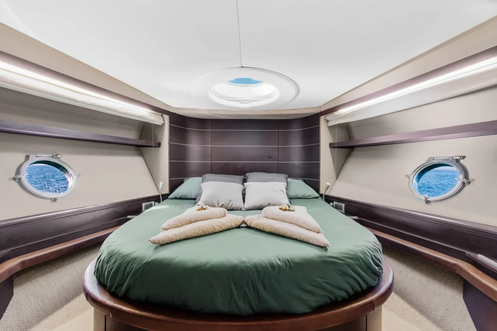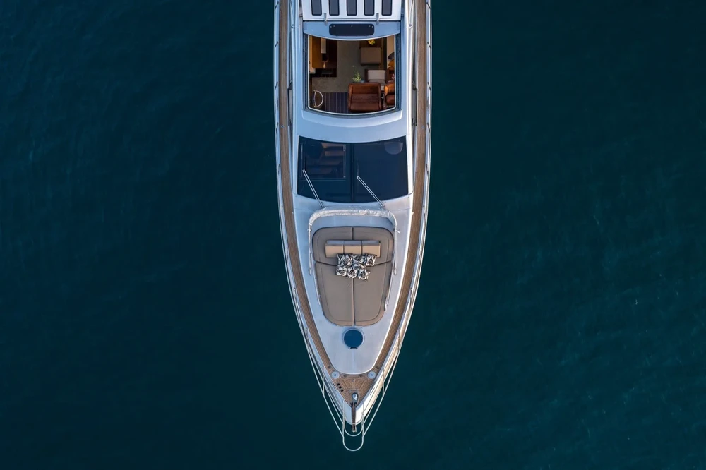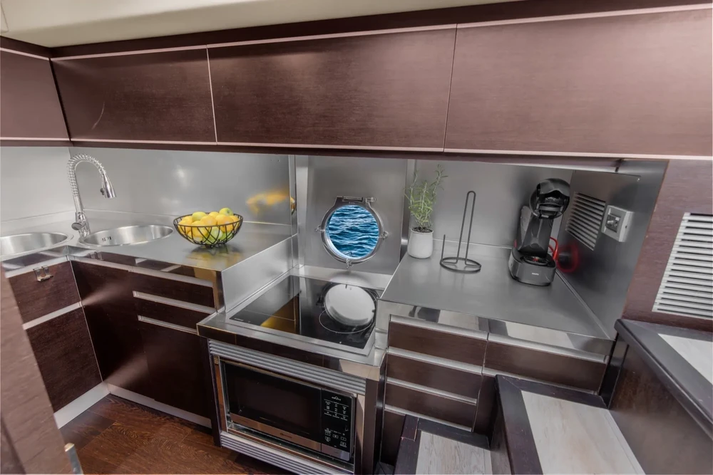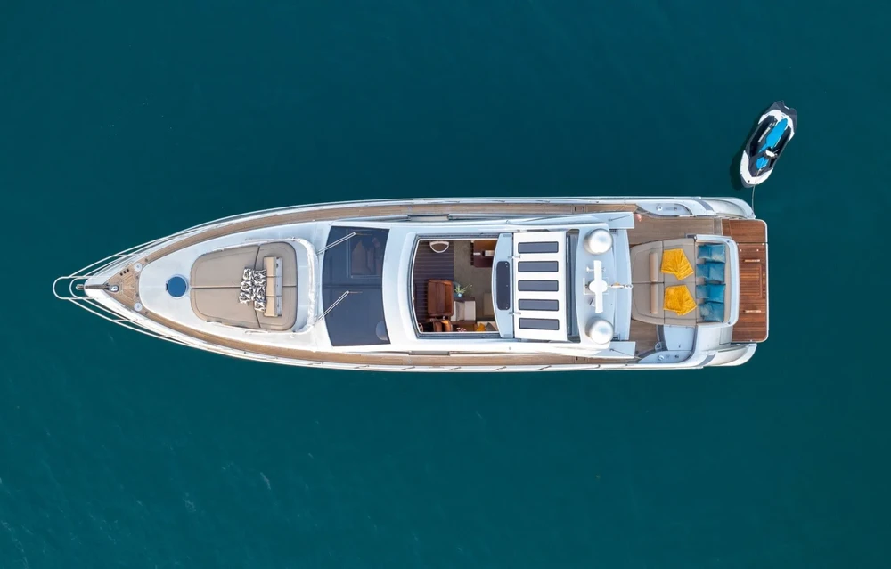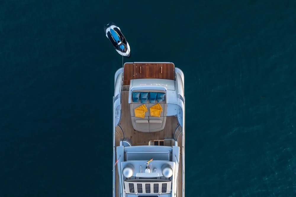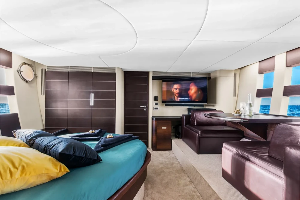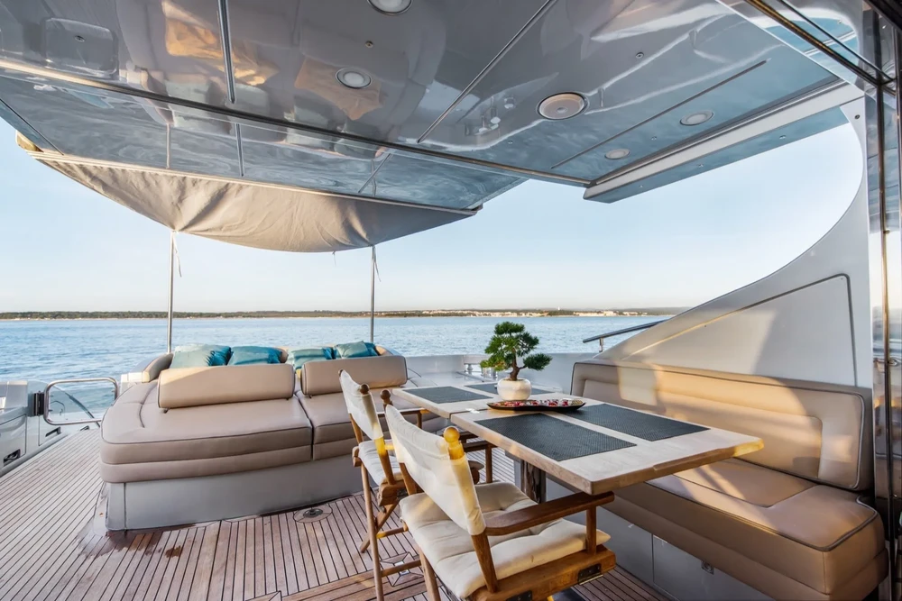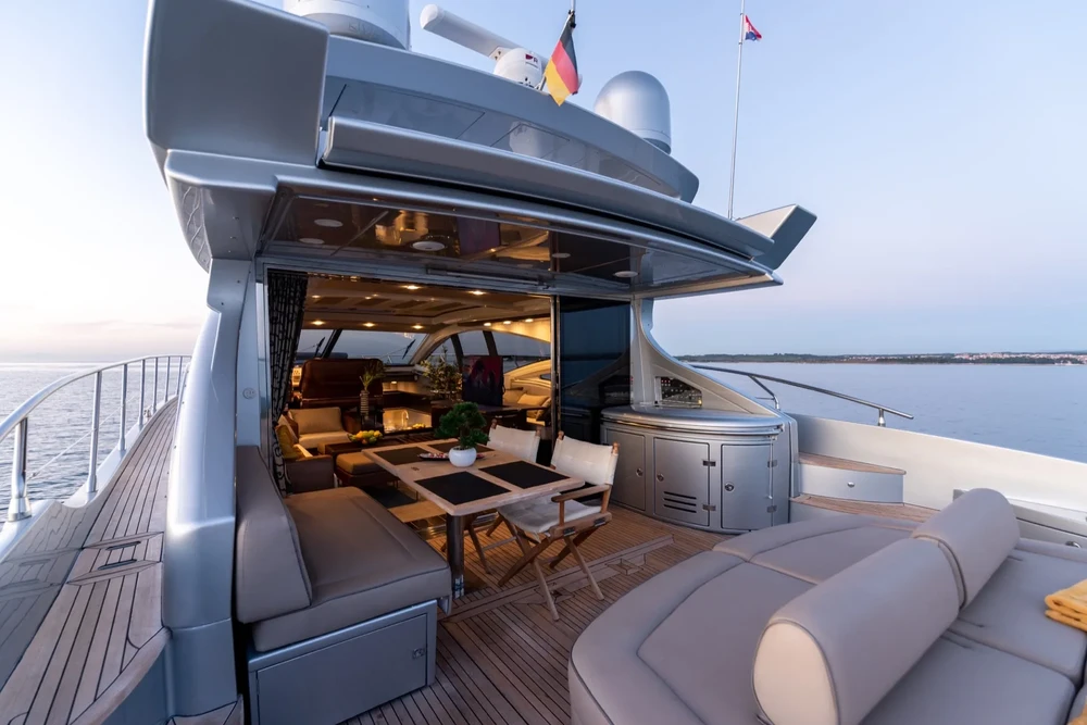 Outside speakers, Deck with dining area, Indoor dining, Minibar outside, Separate cabins for cews, Sun Mattresses, Ice maker, Summer tent, Coffee machine, Electric fridge, Towels