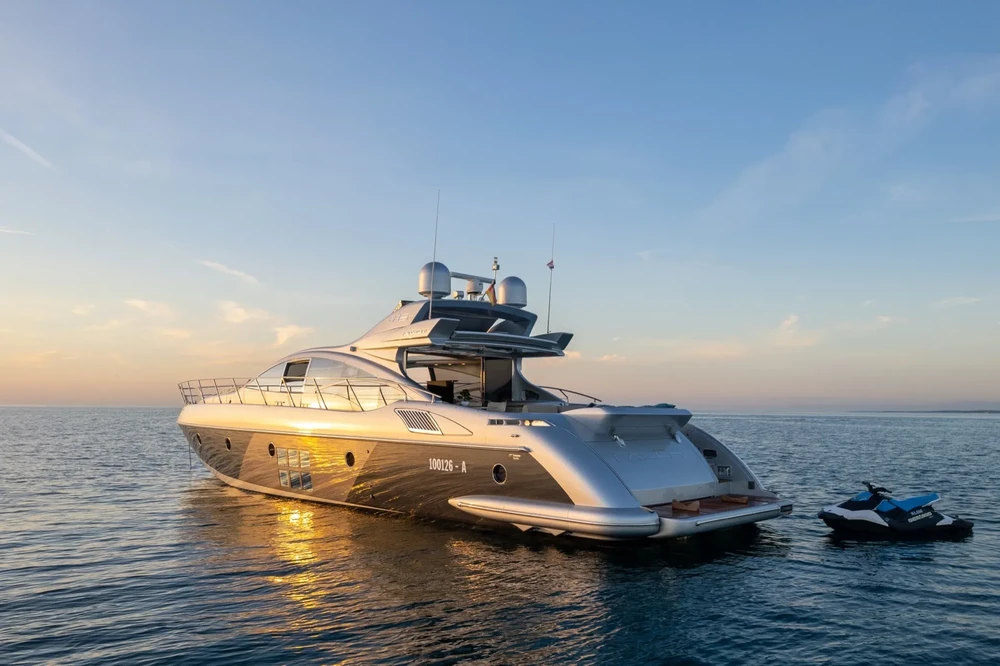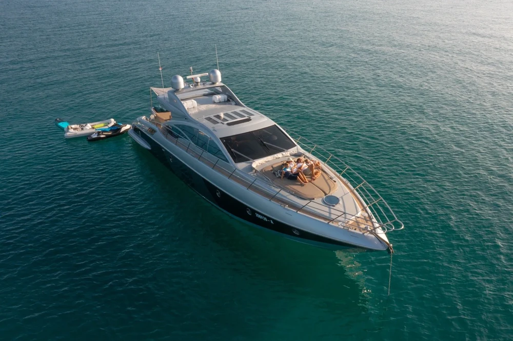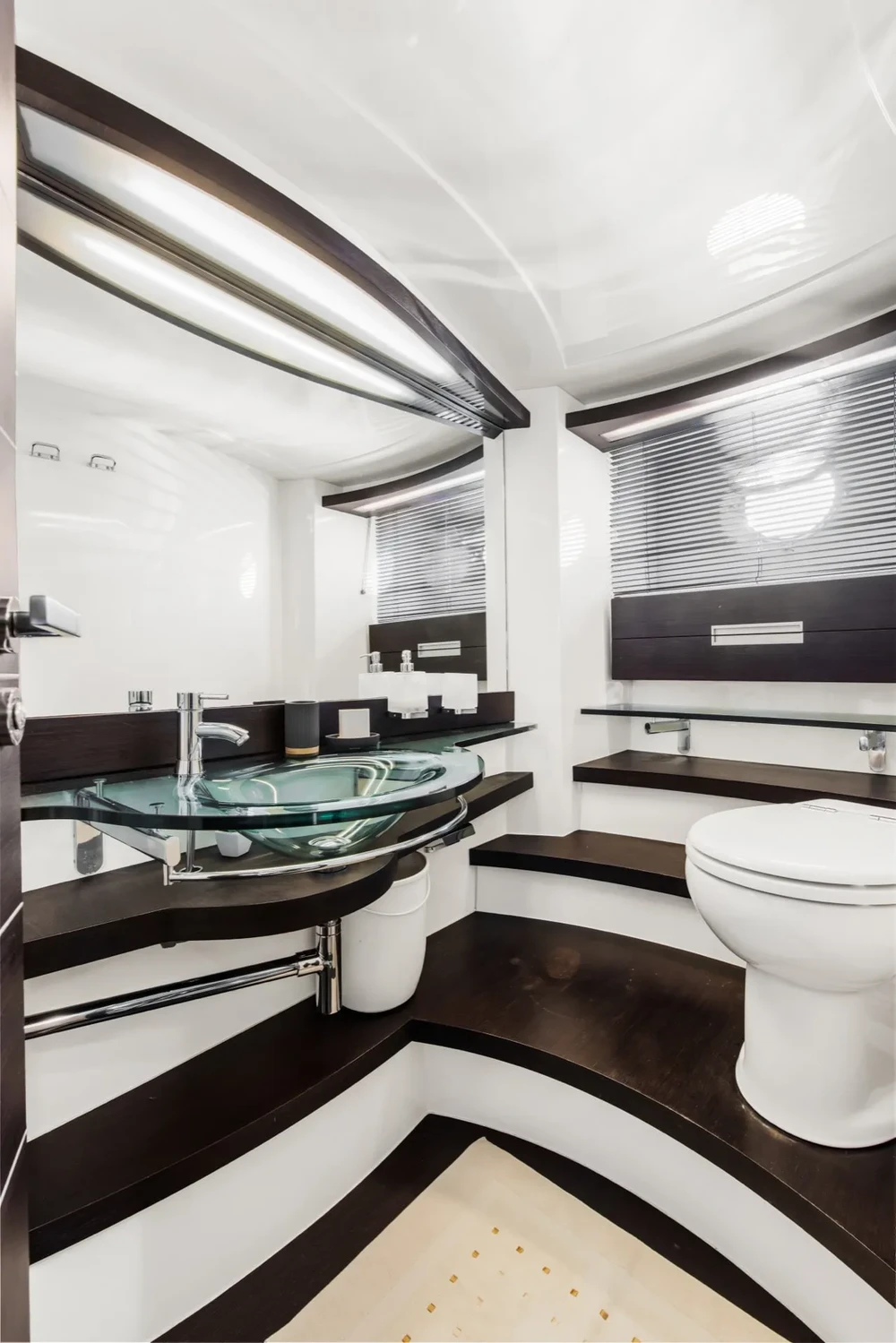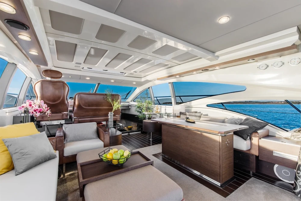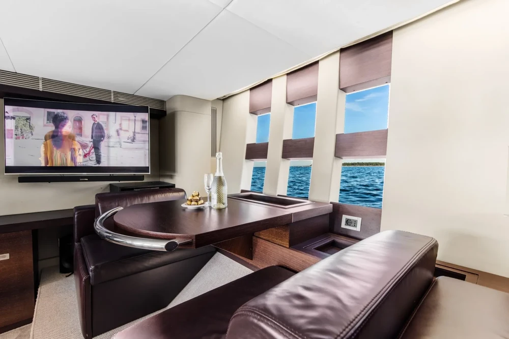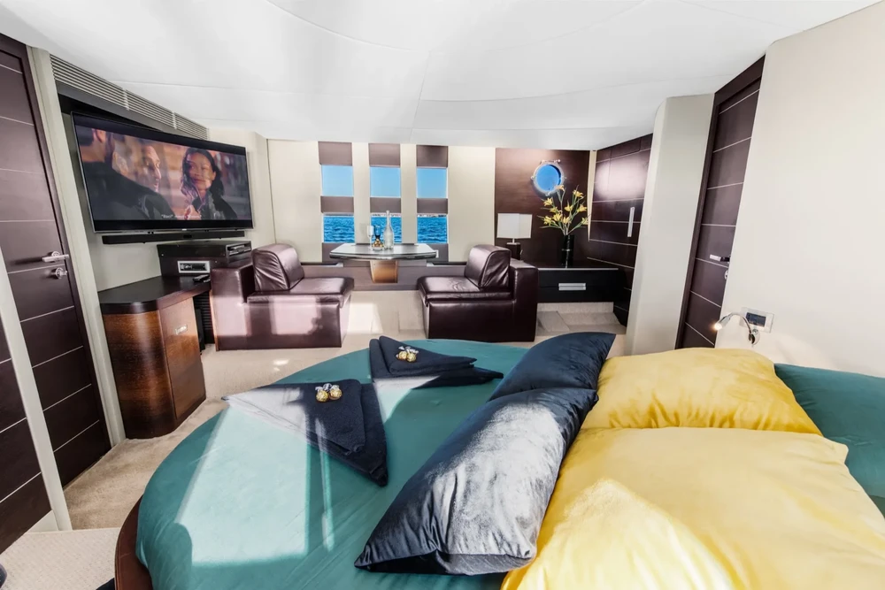 Outside speakers, Deck with dining area, Indoor dining, Minibar outside, Separate cabins for cews, Sun Mattresses, Ice maker, Summer tent, Coffee machine, Electric fridge, Towels