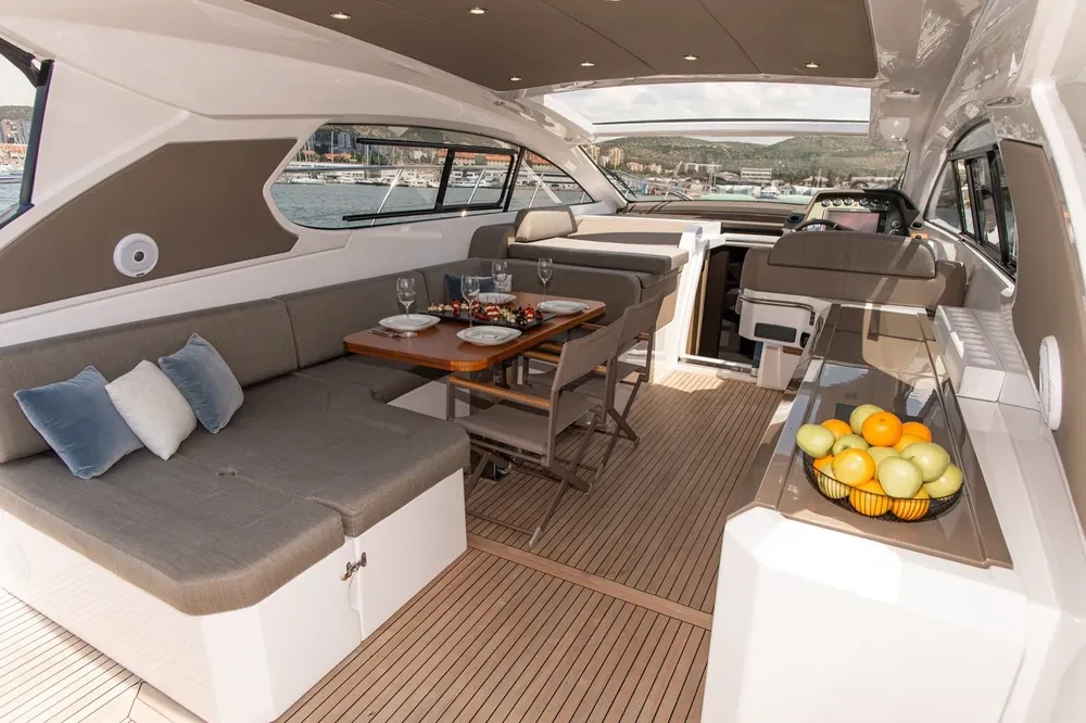 Atlantis 50 it`s a sporty elegance with sleek, harmonious lines. The main deck of the Atlantis 50 runs along a single level, with the exterior and interior seamlessly merging in the Open version. Cruising is rendered particularly comfortable by the hull designed for moving lightly on the sea. A door separates the saloon and the exterior in the Coupé version: the perfect layout for those who prefer separate environments and an interior living area.