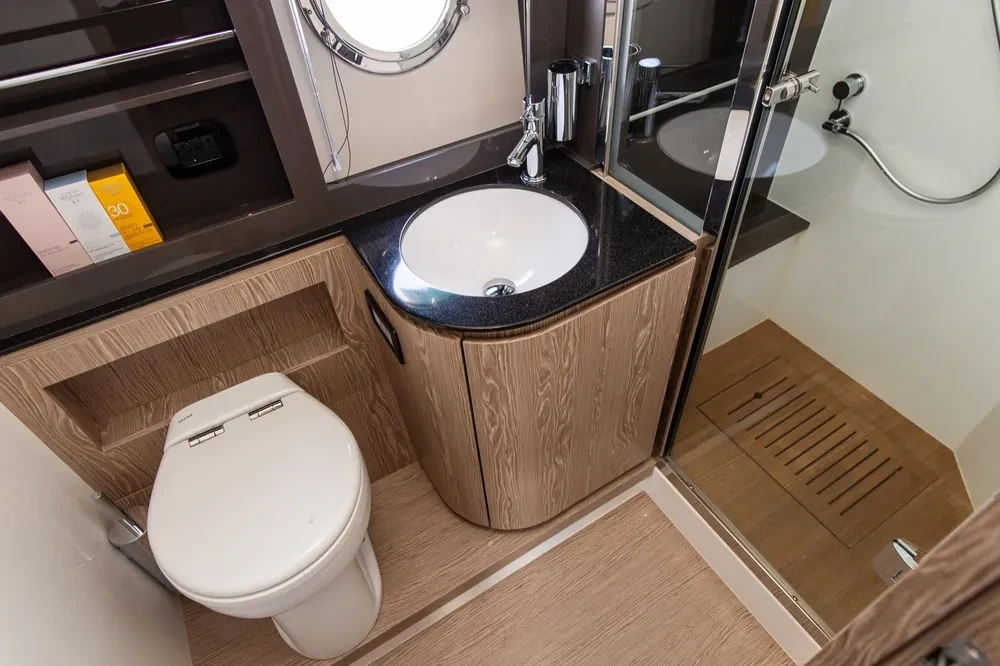 The cosy living area is designed to reconcile different needs and functions. The sleeping area lies in the lower deck, where the entrance to the cabins is flooded by light, in a continuous exchange with the exterior and offering immediate contact with the sun. Everything contributes to the realisation of being truly at sea, in elegant suites equipped with every comfort and marked by sophisticated design. The bathrooms, each with a separate entrance, are equipped with a separate shower booth, to ensure the utmost privacy at the end of the day.