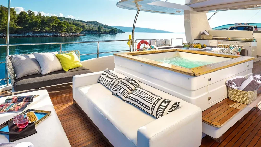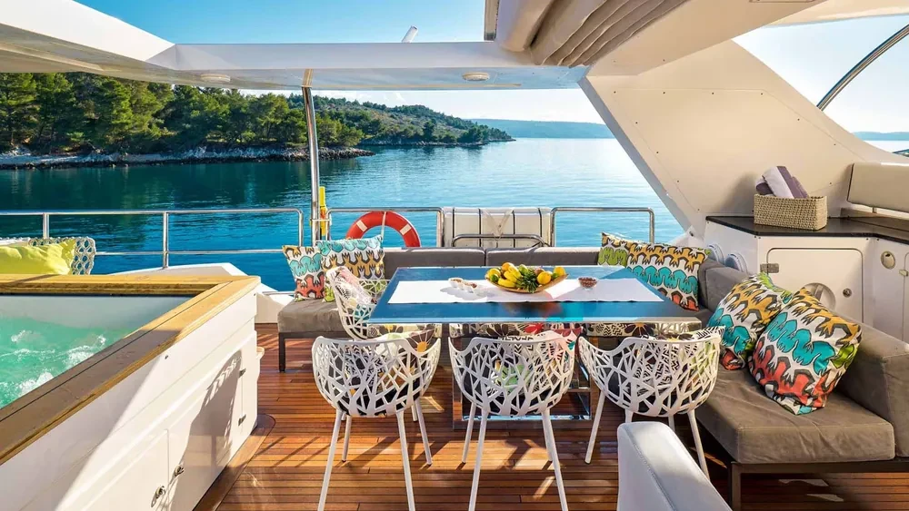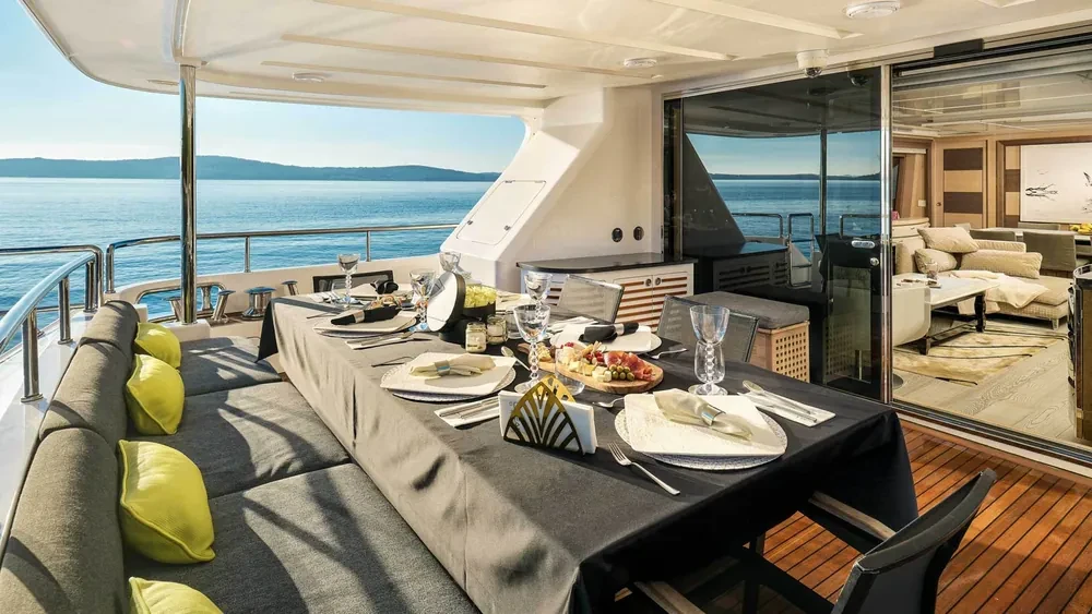 Deck with dining area, Indoor dining, Minibar outside, Separate cabins for cews, Sun Mattresses