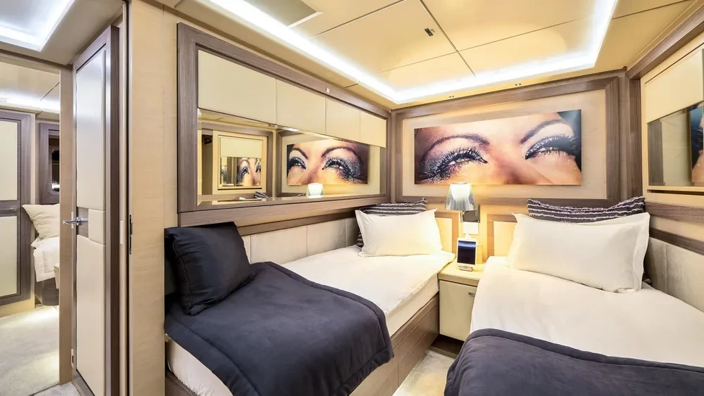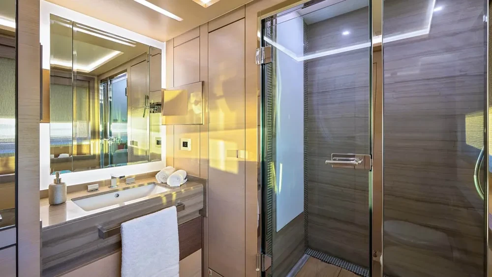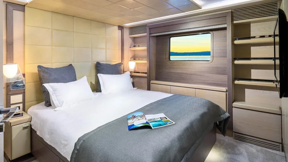 She offers 5 en suite cabins, including Master suite, two VIP cabins and two twin cabins. Located on the main deck, the Master suite offers sophisticated and relaxing atmosphere. Stabilisers at anchor and underway will ensure the comfort and smooth cruise.